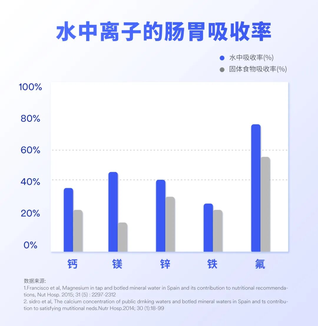 以"钙" 为例,处于成长发育阶段的青少年和面临骨质疏松问题的中老年人,更需要重视钙质的摄取。其通过饮用水摄取的肠胃吸收率,约为通过食物吸收的 1-2 倍。而 "氟" 是预防龋齿的微量元素,其水中吸收率达近100%。