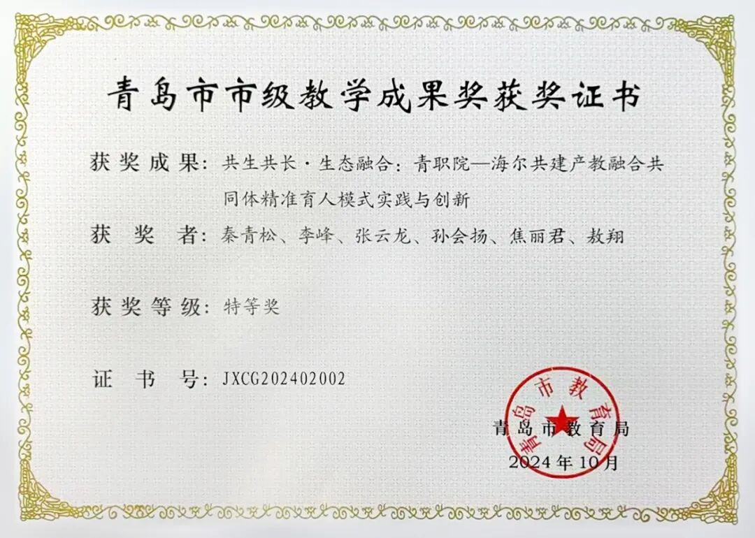 近日,青岛市举行市级教学成果奖颁奖仪式,以表彰在教育领域取得显著成就的个人和团队。由卡奥斯COSMOPlat申报的一项名为“共生共长·生态融合:青职院-海尔共建产教融合共同体精准育人模式实践与创新”的教学成果荣获特等奖。