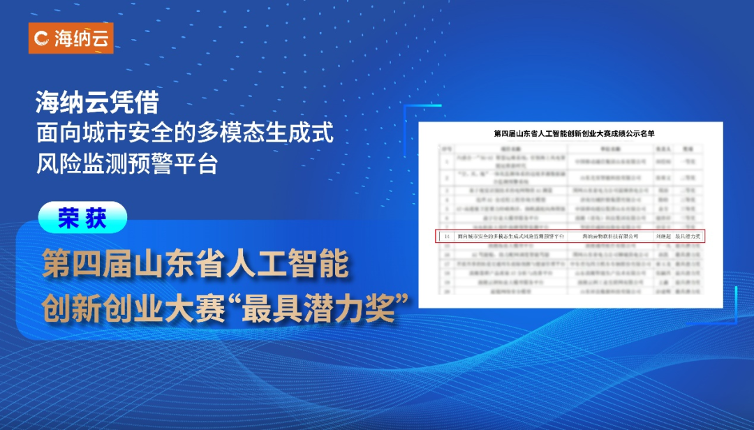 12月3日,由山东省工业和信息化厅等主办,山东省人工智能协会等承办的“第四届山东省人工智能创新创业大赛”成绩出炉。海纳云“面向城市安全的多模态生成式风险监测预警平台”从242个参赛项目中脱颖而出,荣获“最具潜力奖”,彰显了政府与行业对其科技创新能力的认可。