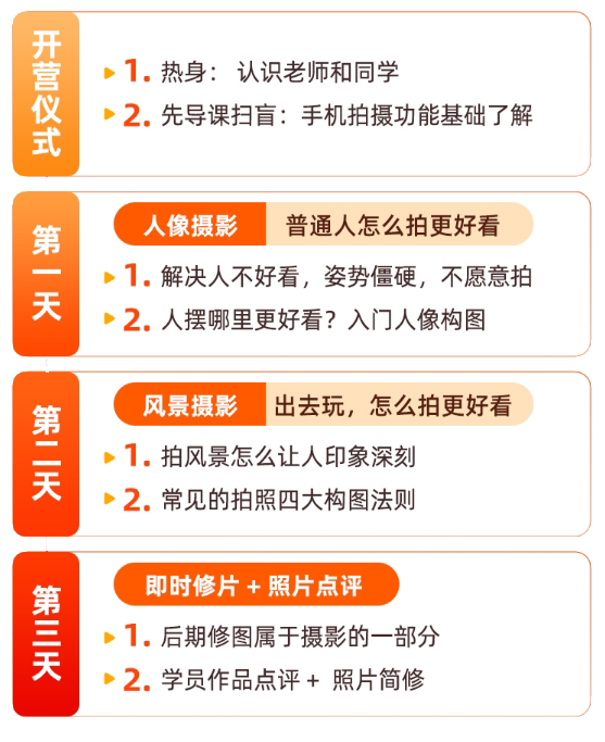 无论是人像还是风景在训练营中都有讲解,甚至后期修图、照片点评等内容也会包含其中。