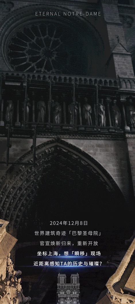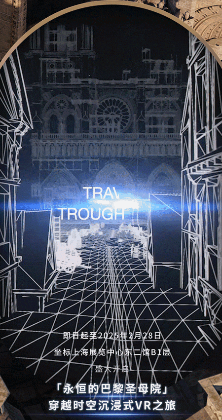 作为「中法文化之春—中法建交 60 周年特别呈现」及「法中文化旅游年」项目之一,「永恒的巴黎圣母院」VR沉浸式体验项目,采用先进的三维扫描技术,1:1复刻巴黎圣母院的一砖一瓦,让观众可以近距离感受这座世界建筑奇迹的深厚历史与璀璨文明。