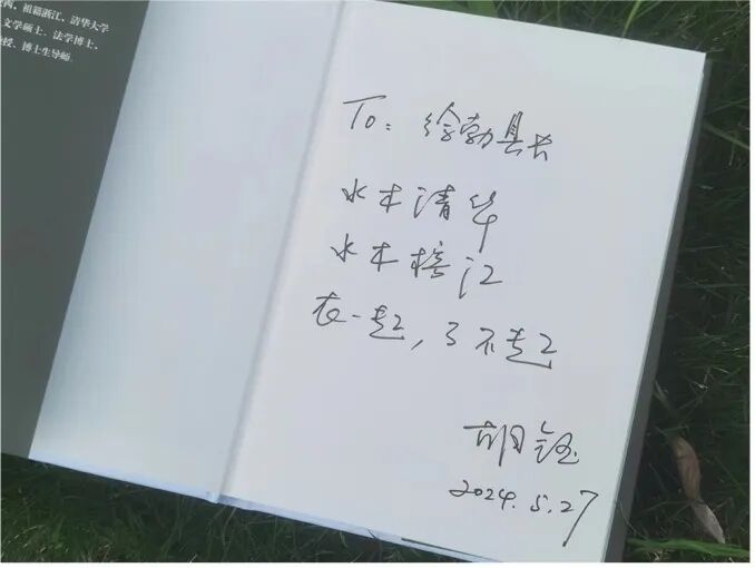 临别时,胡钰教授将自己的随笔集《水木烙印》赠送给清华校友徐勃县长,扉页题字“水木清华,水木榕江,在一起,了不起”。这14个字里,既有清华精神跨越千里的共鸣共和,也有对榕江“村超”发展的美好祝福。