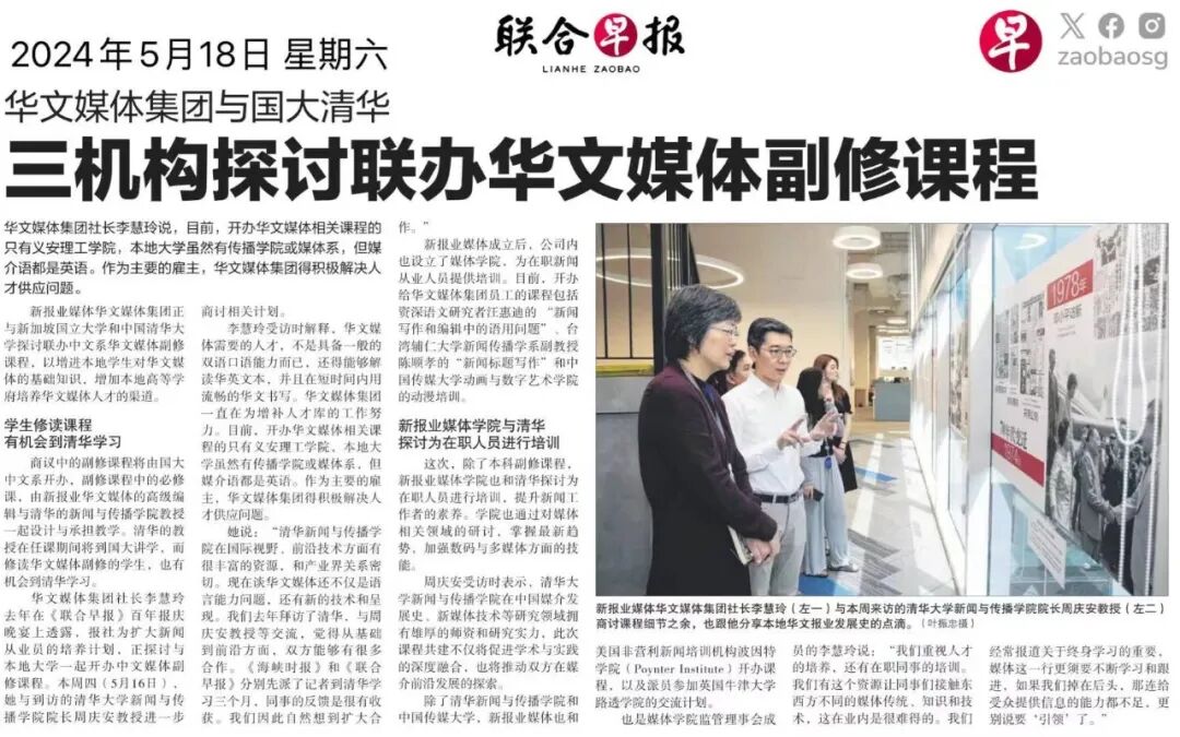 据了解,新报业媒体华文媒体集团已在2023年秋季学期和2024年春季学期选派两名记者赴清华大学新闻与传播学院进行交流访问。同时,清华大学新闻与传播学院也选派了两名来自国际新闻和影视传播专业方向的优秀硕士生赴新加坡实习。