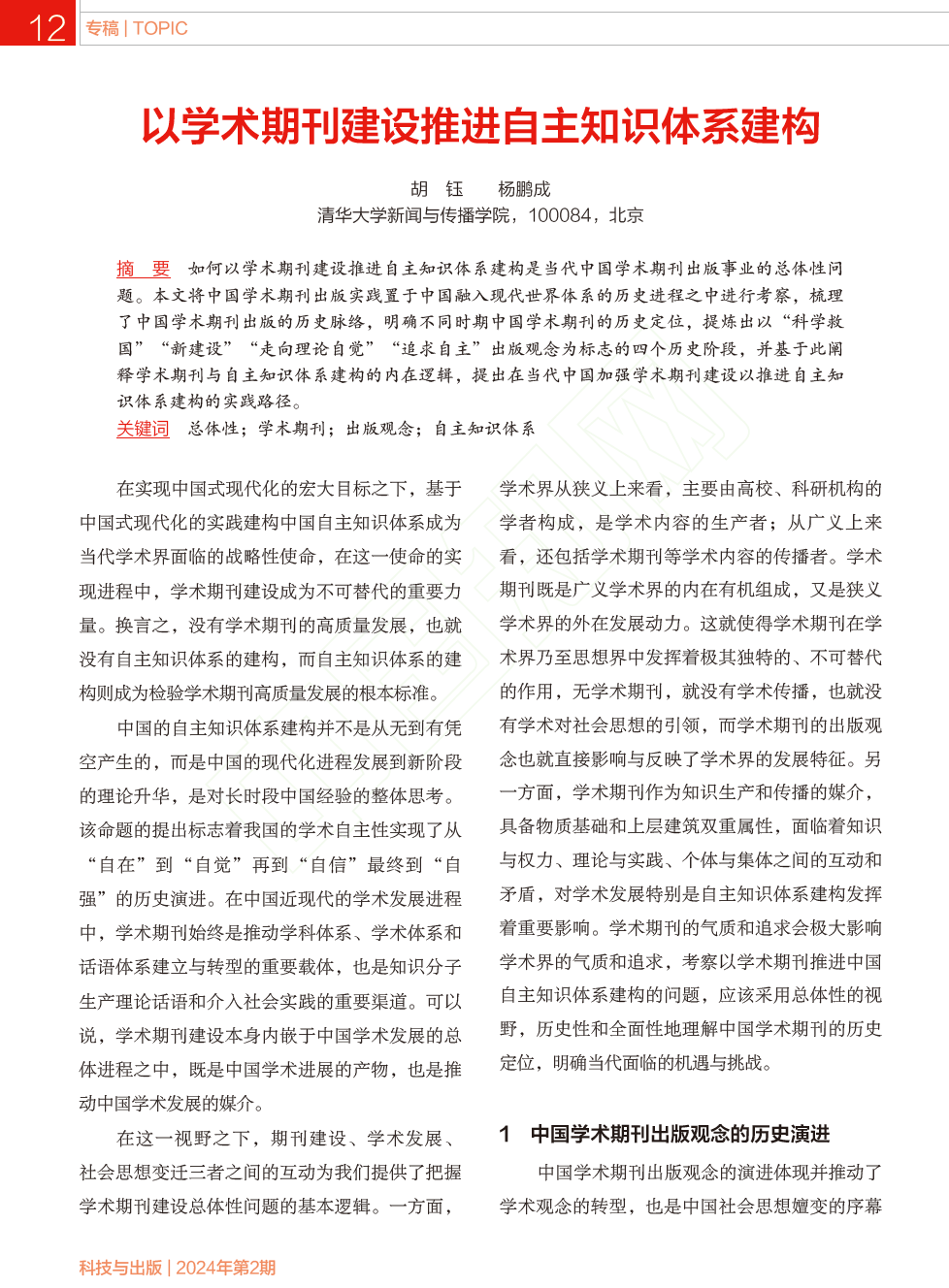 【摘要】如何以学术期刊建设推进自主知识体系建构是当代中国学术期刊出版事业的总体性问题。本文将中国学术期刊出版实践置于中国融入现代世界体系的历史进程之中进行考察,梳理了中国学术期刊出版的历史脉络,明确不同时期中国学术期刊的历史定位,提炼出以“科学救国”“新建设”“走向理论自觉”“追求自主”出版观念为标志的四个历史阶段,并基于此阐释学术期刊与自主知识体系建构的内在逻辑,提出在当代中国加强学术期刊建设以推进自主知识体系建构的实践路径。