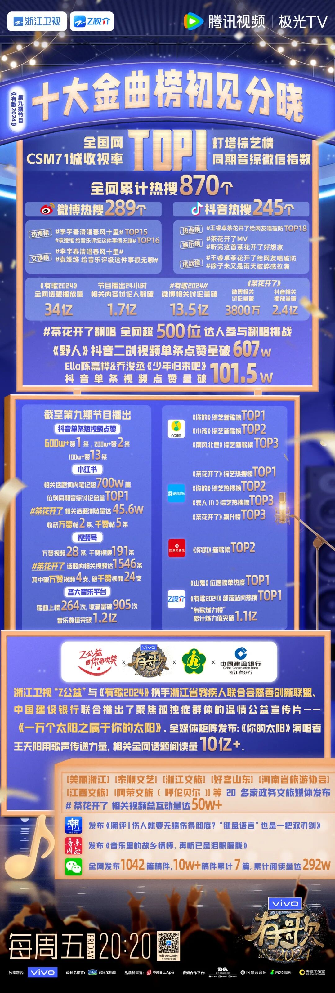 节目播出后,全国网、CSM71城收视率稳居TOP1,同时斩获灯塔综艺榜TOP1、同期音综微信指数TOP1。全网累计热搜870个,《有歌2024》全网话题播放量34亿。其中,Ella陈嘉桦&乔浚丞《少年归来吧》抖音单条视频点赞量破101.5万。此外,浙江工视“Z公益”与《有歌2024》携手浙江省残疾人联合会慈善创新联盟、中国建设银行联合推出了聚焦孤独症群体的温情公益宣传片——《一万个太阳之属于你的太阳》。更有美丽浙江、泰顺文艺、浙江文旅、好客山东、河南省旅游协会、江西文旅 、阿荣文旅(呼伦贝尔)等多家政务文旅媒体发布节目相关视频,共赴音乐之旅,为好歌点赞!
