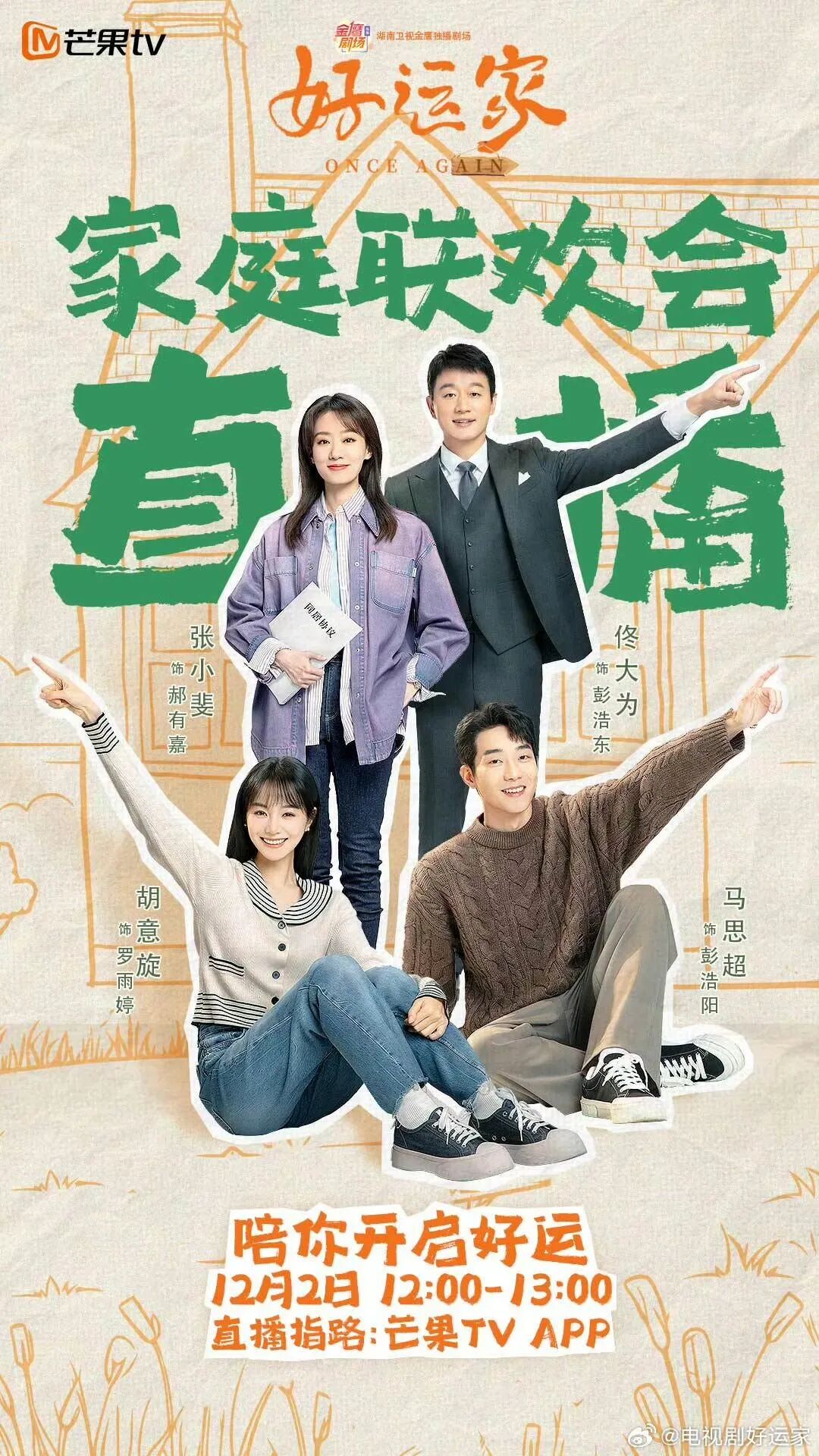 《好运家》由安建执导,袁子弹编剧,张小斐、佟大为、陈小艺领衔主演,郭涛特别出演,马思超、隋俊波、于毅、胡意旋、徐百慧等共同主演,岳红、袁文康特邀出演。该剧搭建了都市男女的情感语境,通过一个个细腻温馨的家庭群像叙事,展现了亲情、爱情与责任之间的复杂关系,为观众呈现一个极具“川”味的重组家庭百味故事。从预热到开播,剧集发布“家系列联动”预告、“接好运”海报等多款创意物料,将大众对《好运家》的期待值拉满,播后三场活动更是打造了满满的“家弛感”,将家庭的温暖治愈情绪从剧里向剧外延展。芒果“家系列”的含金量上升