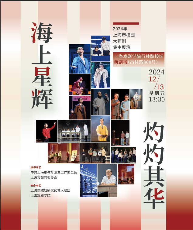 由上海市教卫工作党委指导,上海高校戏剧文化育人联盟与上海戏剧学院联合主办的“2024年上海市校园大师剧集中展演”,将于12月13日在上海戏剧学院新剧场举行。