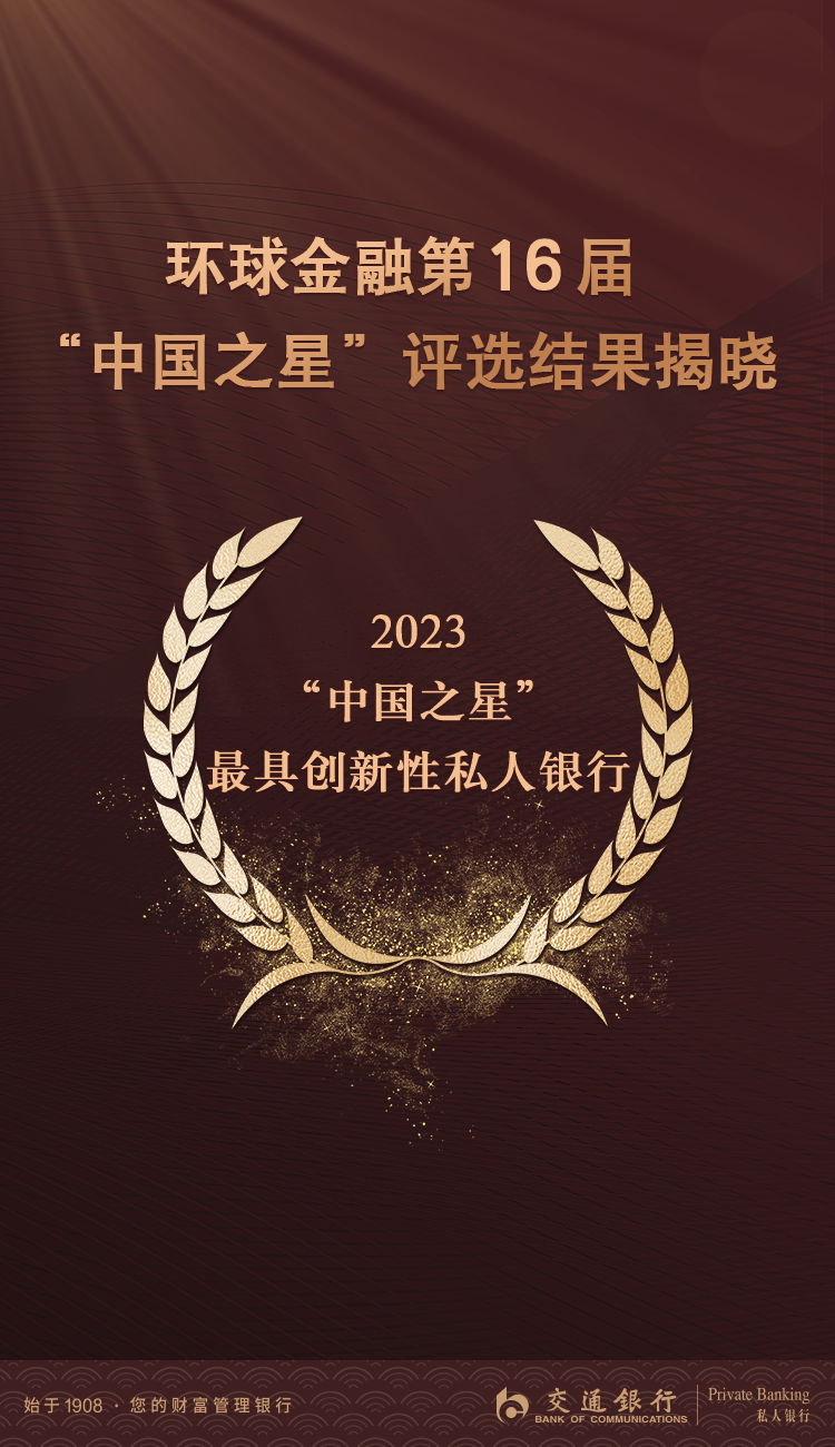 近日,交行荣获《环球金融》杂志评选的 2023 中国之星——最具创新性私人银行奖。该奖项已由《环球金融》举办16届,是国际媒体评价中国金融机构和其他组织的杰出代表,以表彰为中国和世界服务表现出色的最佳中资银行,是业界权威奖项,具有较高的社会认可度、市场公信力和行业影响力。
