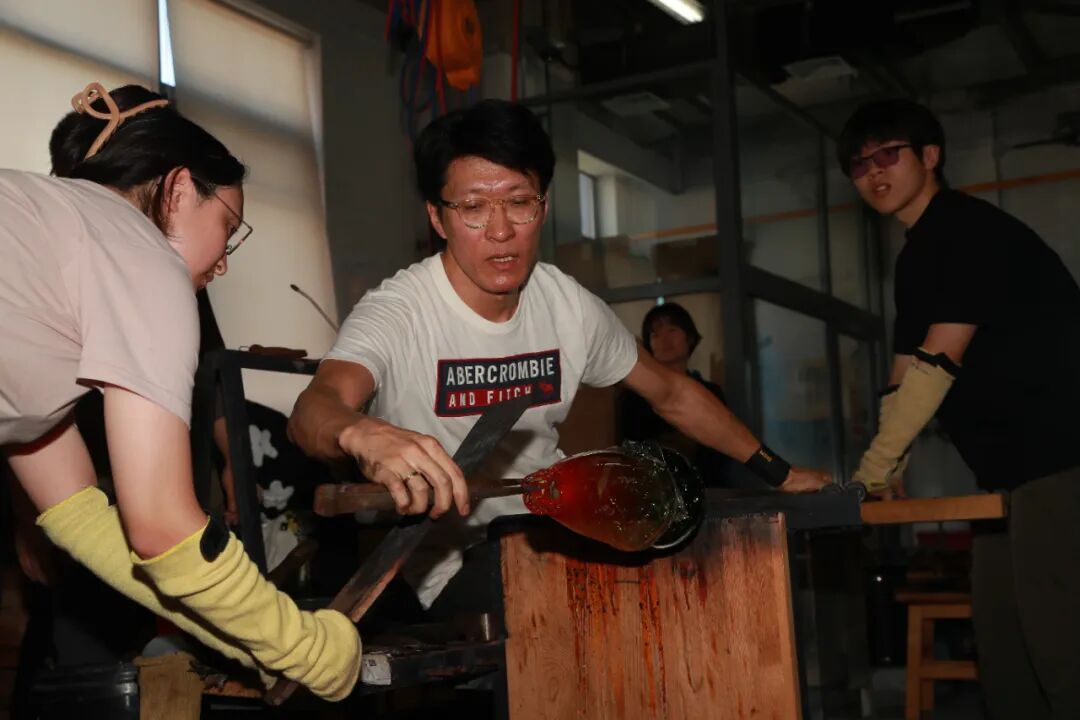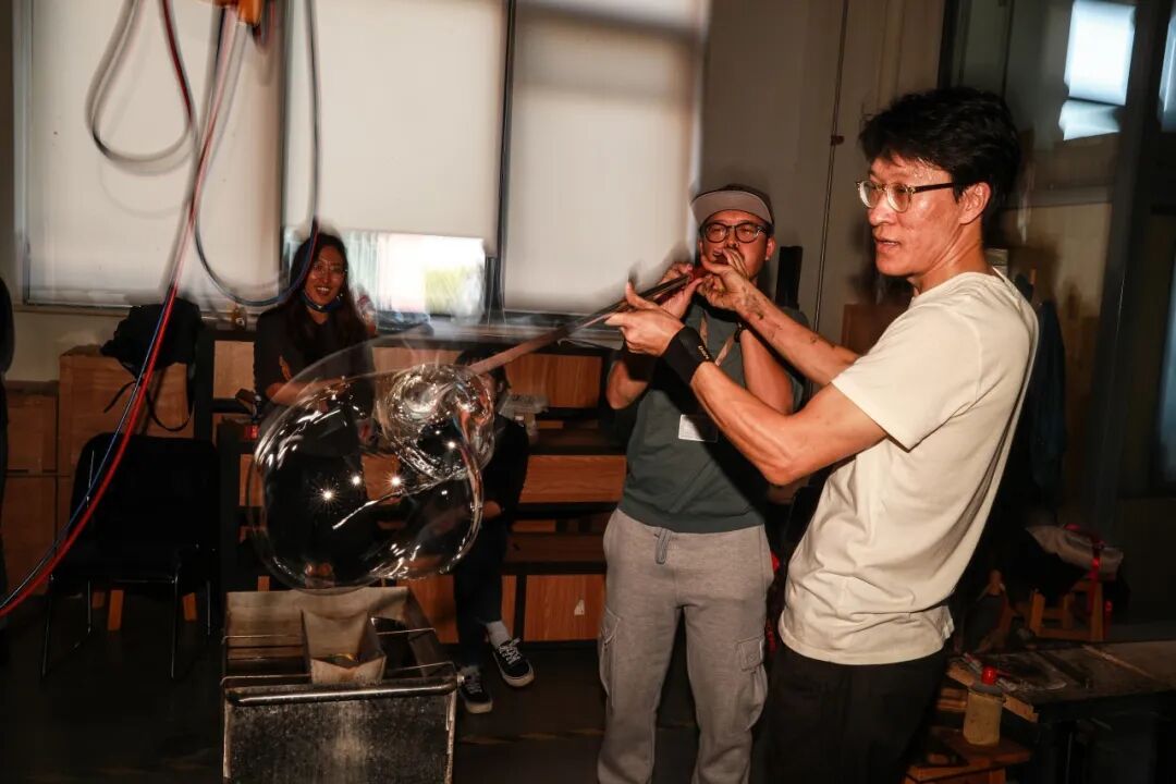 李静老师及其团队对材料特性的深刻理解及对温度的精准把控得到了充分体现。经过几十次加热、吹制、塑形的工序后,玻璃料在李静老师的手中逐渐成型。所有工序完成后,李静老师将玻璃器送入退火窑中。在创作的间隙,他还邀请嘉宾亲自体验玻璃吹制,随着气体的吹入,玻璃泡逐渐膨胀,如同肥皂泡一般在灯光下折射出璀璨的光芒,让嘉宾们深切感受到了玻璃艺术制作的乐趣。