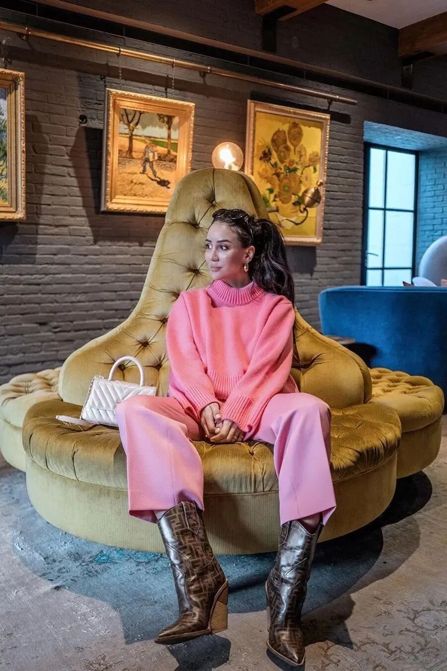针织元素是粉色调天然的好搭档,两者的温暖气质相辅相成,营造出浓浓的温馨感。