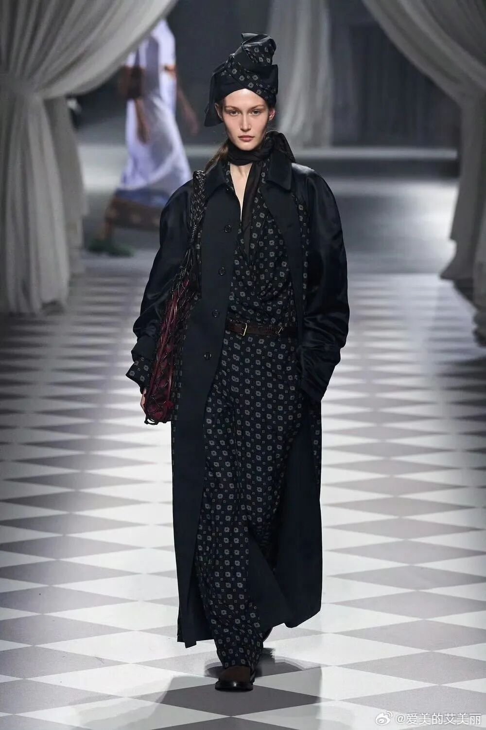 无独有偶,Moschino 2024秋冬系列的头巾要更加放肆,设计师将缀有波点印花的头巾与风衣、连体裤、深V衬衫等单品结合,别有意趣。