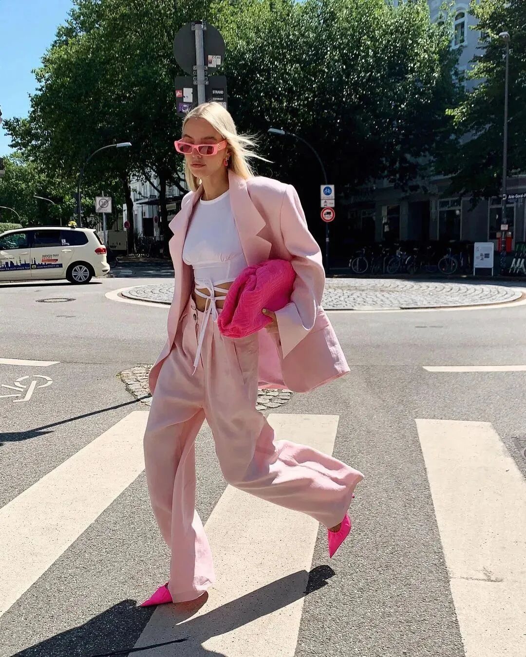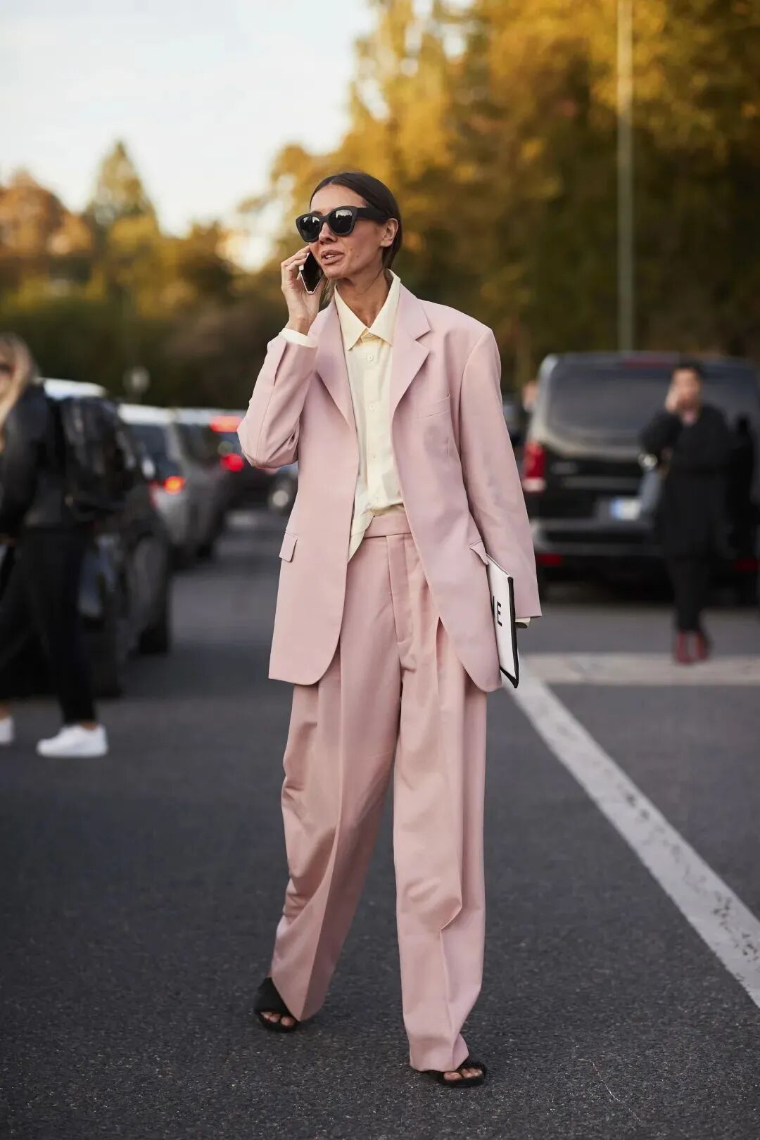穿够了黑白灰通勤的姐妹也可以试试粉色的西服套装,Power suit也可以soft起来~