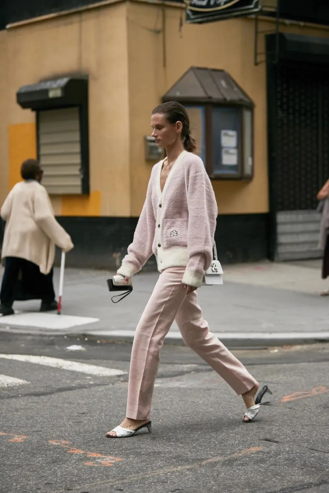 私服造型中的粉色含量也是严重超标!从针织开衫到休闲长裤都相当亮眼。