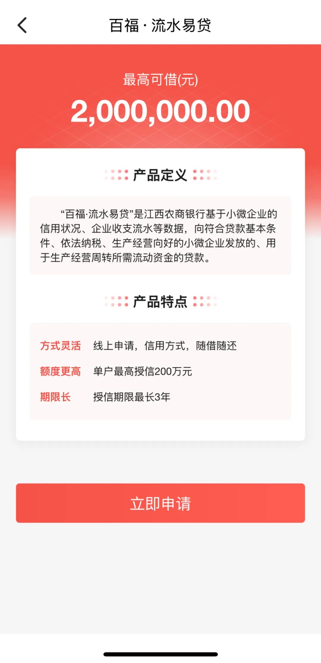 “百福·流水易贷”是江西·农商银行基于小微企业的信用状况、人行企业收支流水大数据等信息,向符合贷款基本条件、依法纳税、生产经营向好的小微企业发放的、用于生产经营周转所需流动资金的贷款。