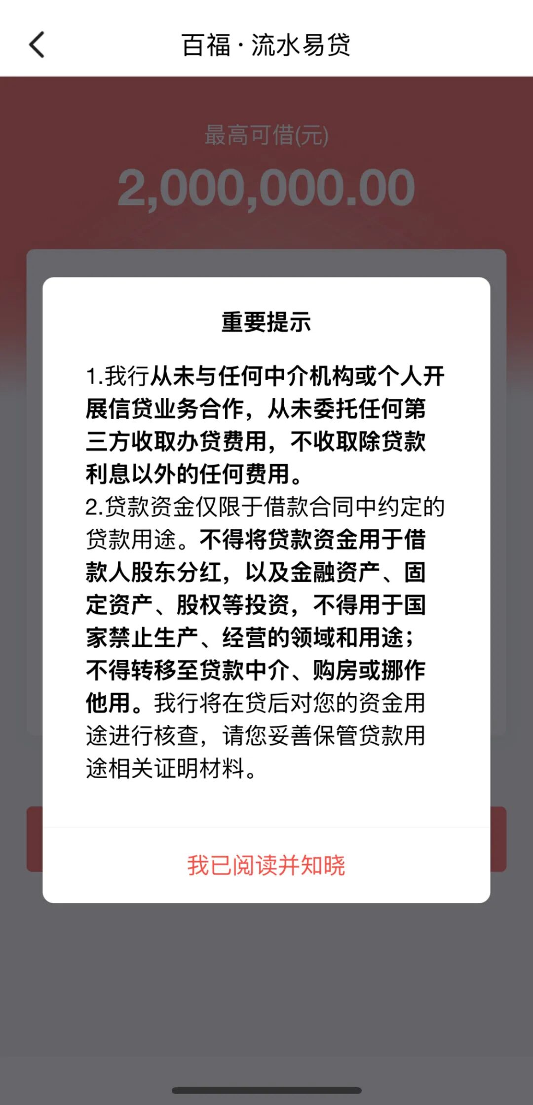 进入“百福·流水易贷”页面,点击“立即申请”按钮,阅读重要提示后,点击“我已阅读并知晓”。