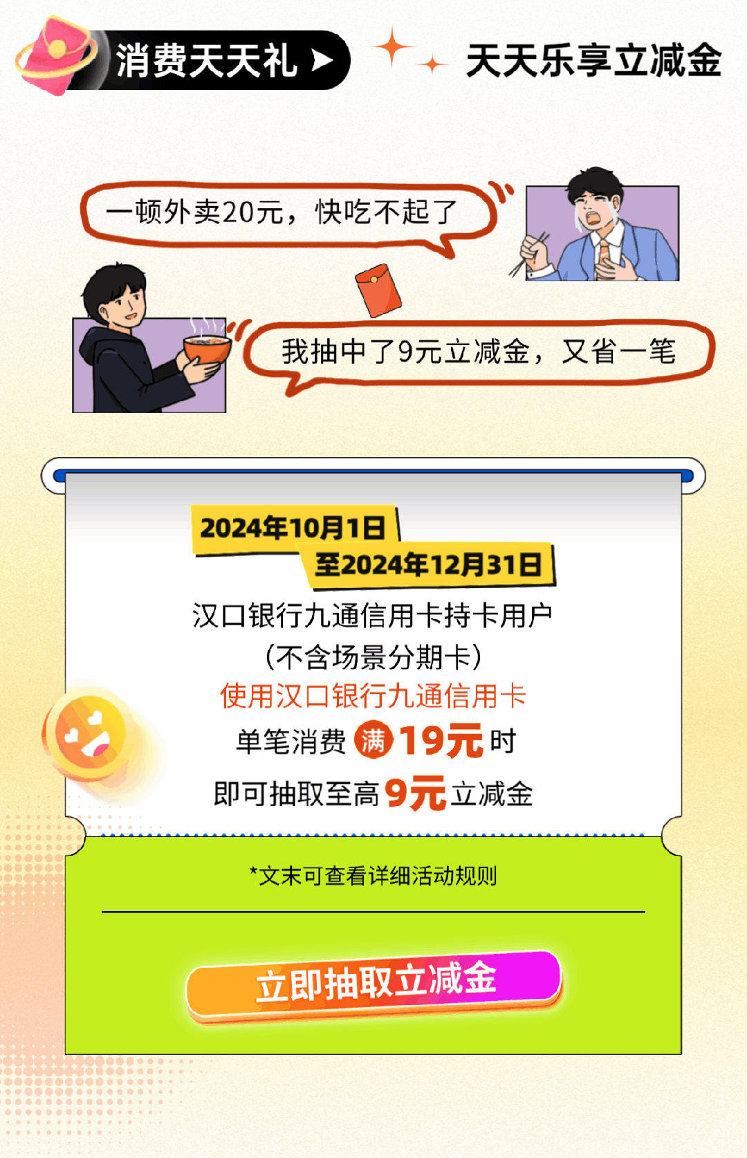 ① 活动期间,汉口银行九通信用卡持卡用户使用汉口银行九通信用卡单笔消费满19元时,即可在【汉口银行九通信用卡】微信公众号的交易提醒中获得抽奖权益。打开交易提醒详情页,即可参与抽奖获得奖励,最高可得9元立减金。