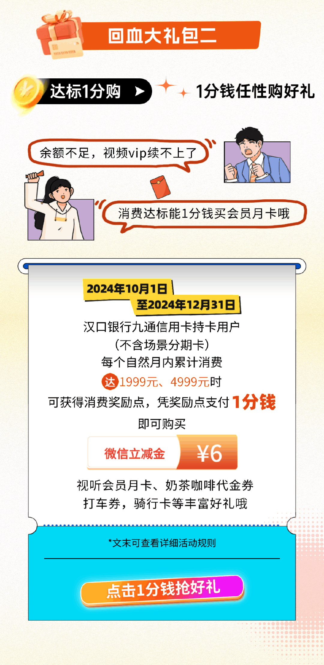 1、本次活动限账户状态正常(非止付、冻结等)的九通银联信用卡主卡持卡人参加,场景分期信用卡不参加本活动;
