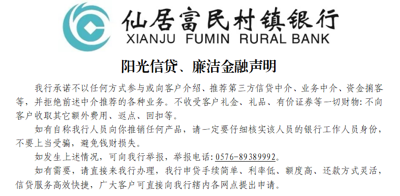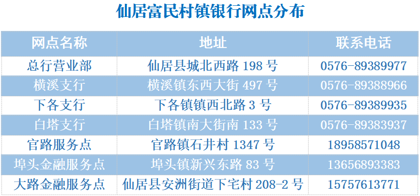 仙居富民村镇银行成立于2016年,成立至今,已开设总行营业部、横溪支行、下各支行、白塔支行四家营业网点,我们致力于推广普惠金融,立足本地,纳税本地,为“三农”、小微企业和社区百姓提供优质金融服务。