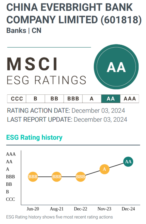 近日,明晟(MSCI)发布2024年度光大银行ESG评级结果,光大银行ESG评级结果提升至AA级,实现评级结果两年连续提升,体现了国际资本市场对光大银行ESG管理水平的认可。