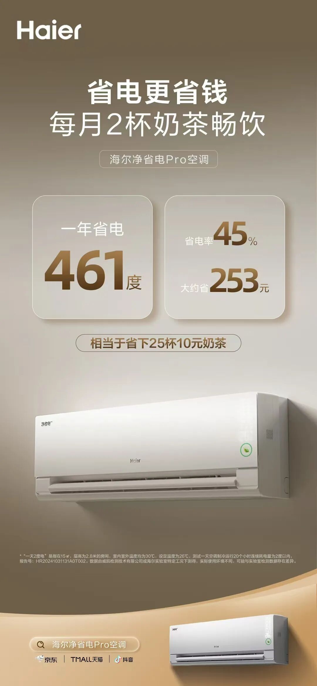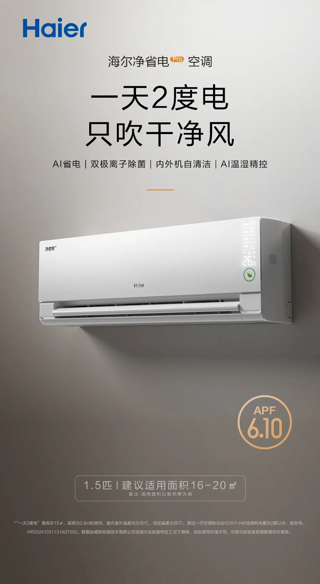 海尔净省电Pro空调APF值高达6.10,平均一天只需2度电,完美契合当下用户对于节能环保产品的追求。这源于这款空调配备了AI智慧节能算法,可以实现精准控温,还可以根据不同使用场景和用户习惯进行自适应调节,找到空调运行的最佳平衡点,确保制热效果的同时,最大限度地降低能耗。