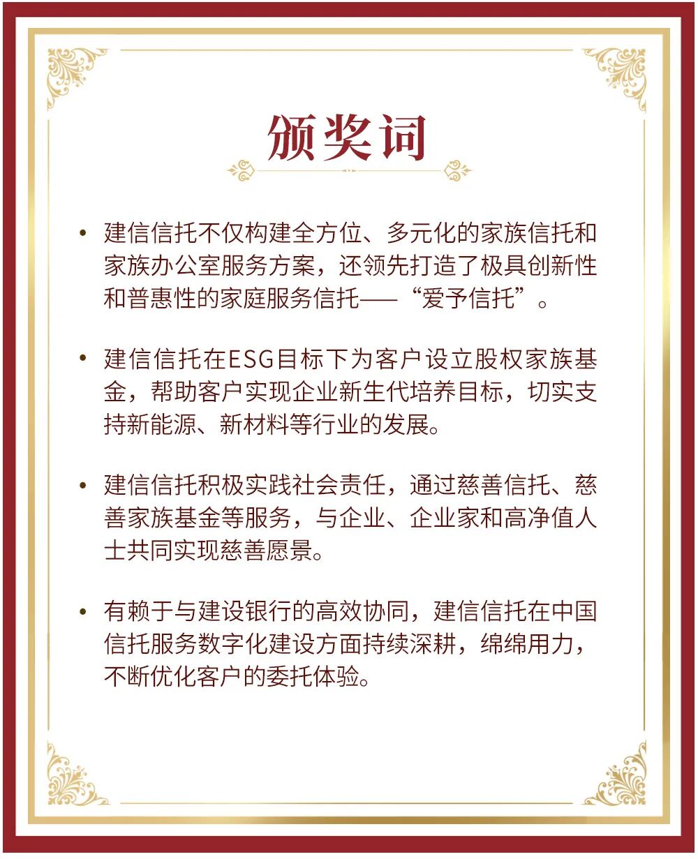 对于建信信托家族信托多年来取得的成就,亚洲银行家在颁奖词中如是评价:
