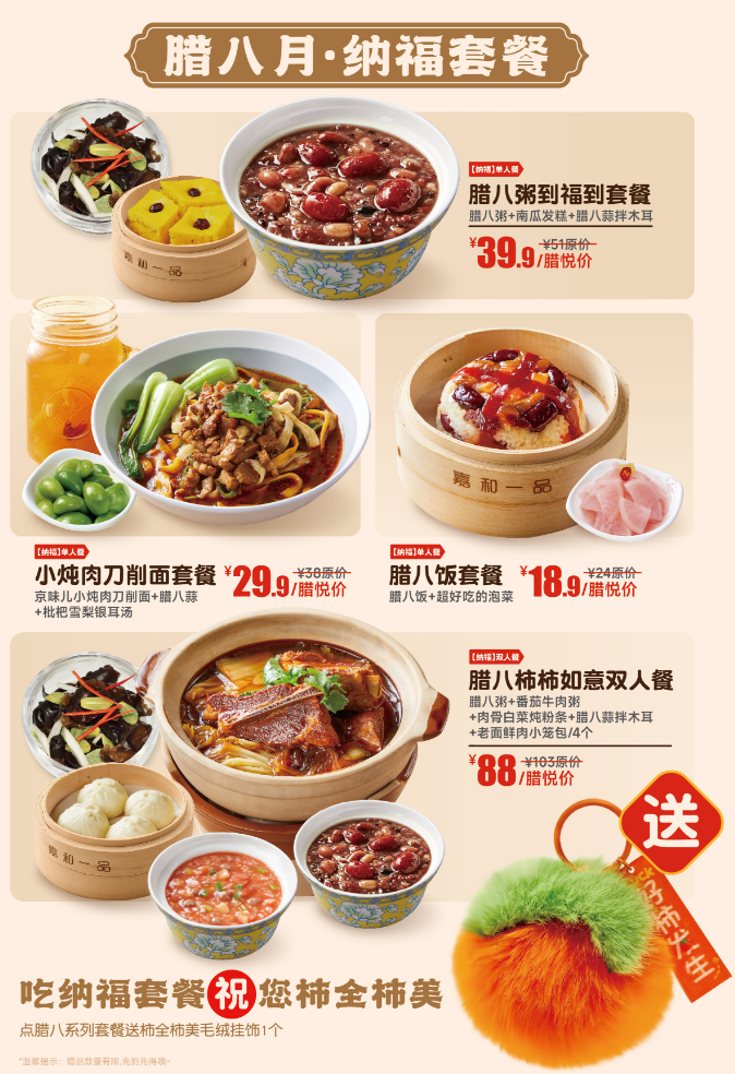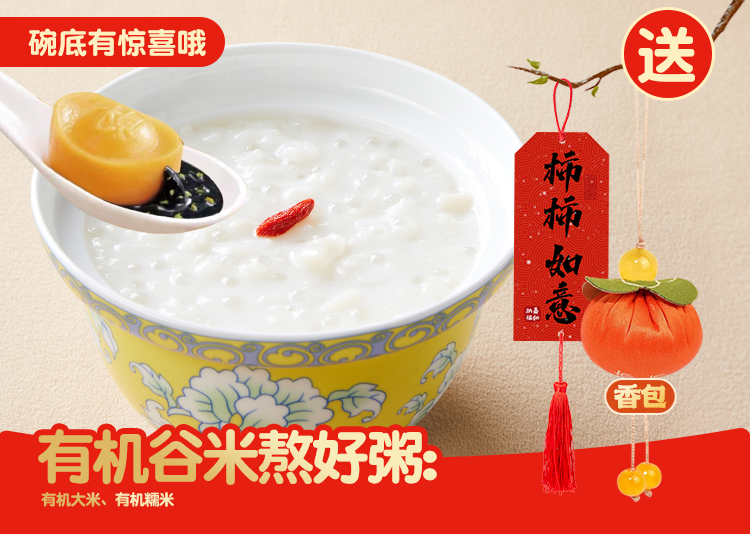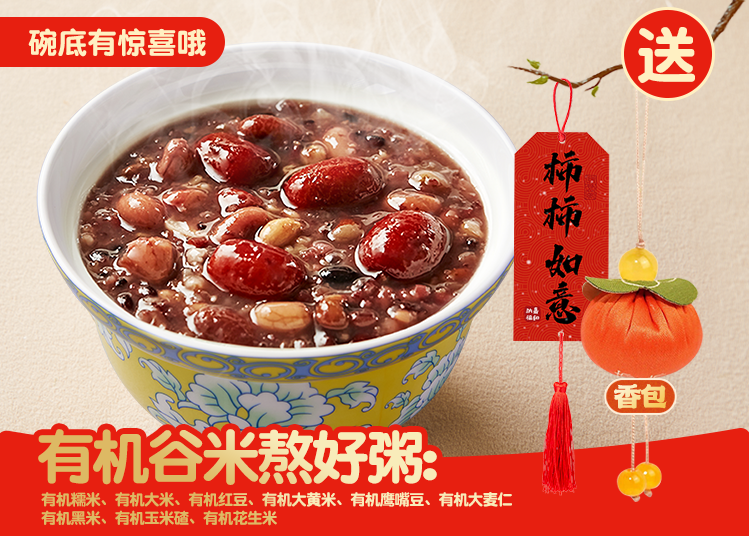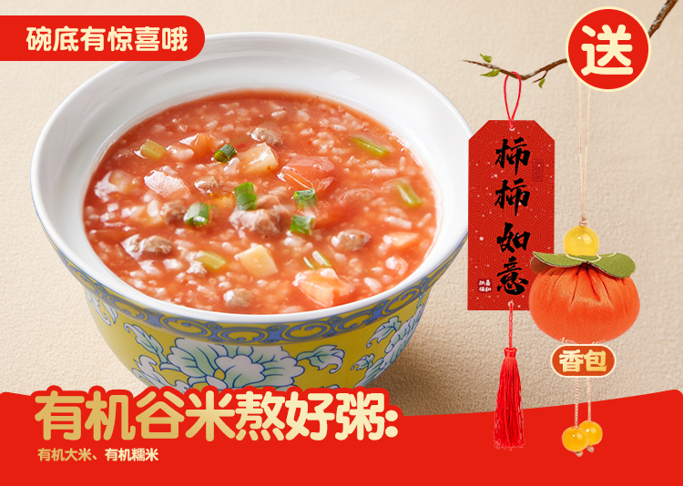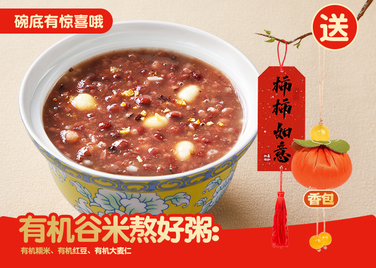 只要你点了纳福粥系列,我们就送祈福福签和杮杮如意香包 1 套!福签上的吉祥话,那都是对未来的美好祝愿;香包拿在手里,新年的好运就稳稳地握在掌心啦!