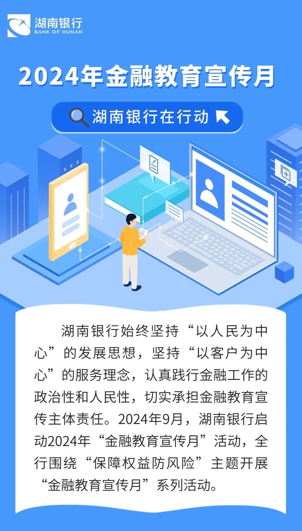 活动期间,湖南银行围绕“金融为民谱新篇 守护权益防风险”口号,通过微信银行、官方网站、电子媒体等互联网渠道进行宣传。同时,总分行联动外部媒体报道活动相关情况,拓宽宣传覆盖面。