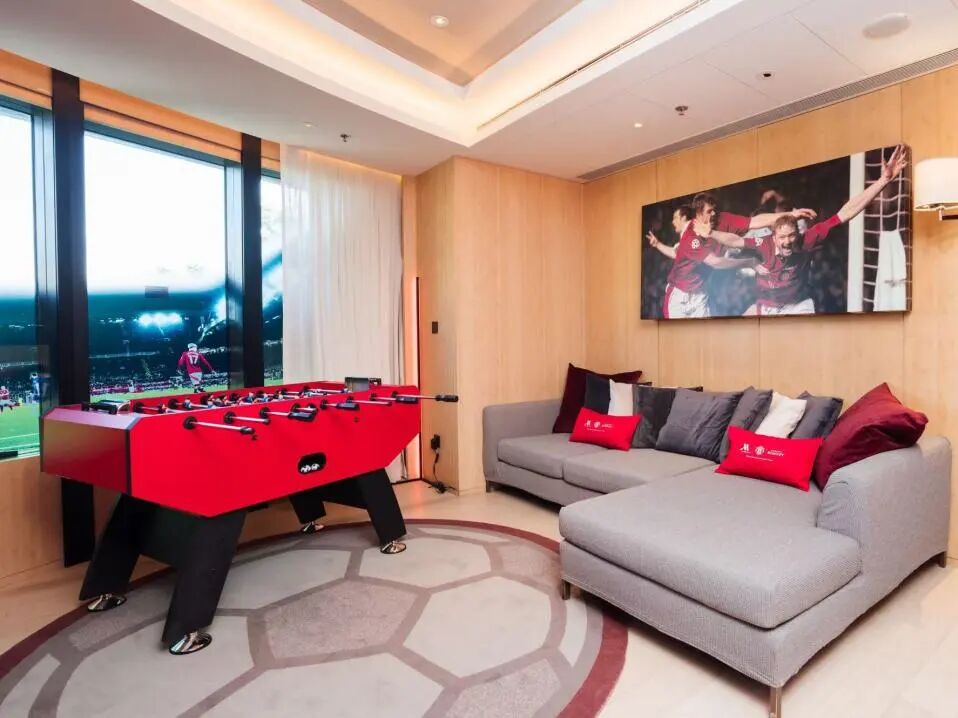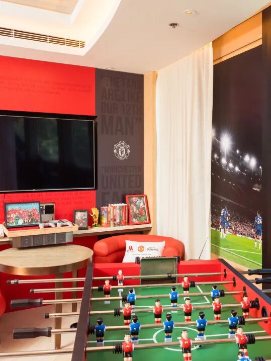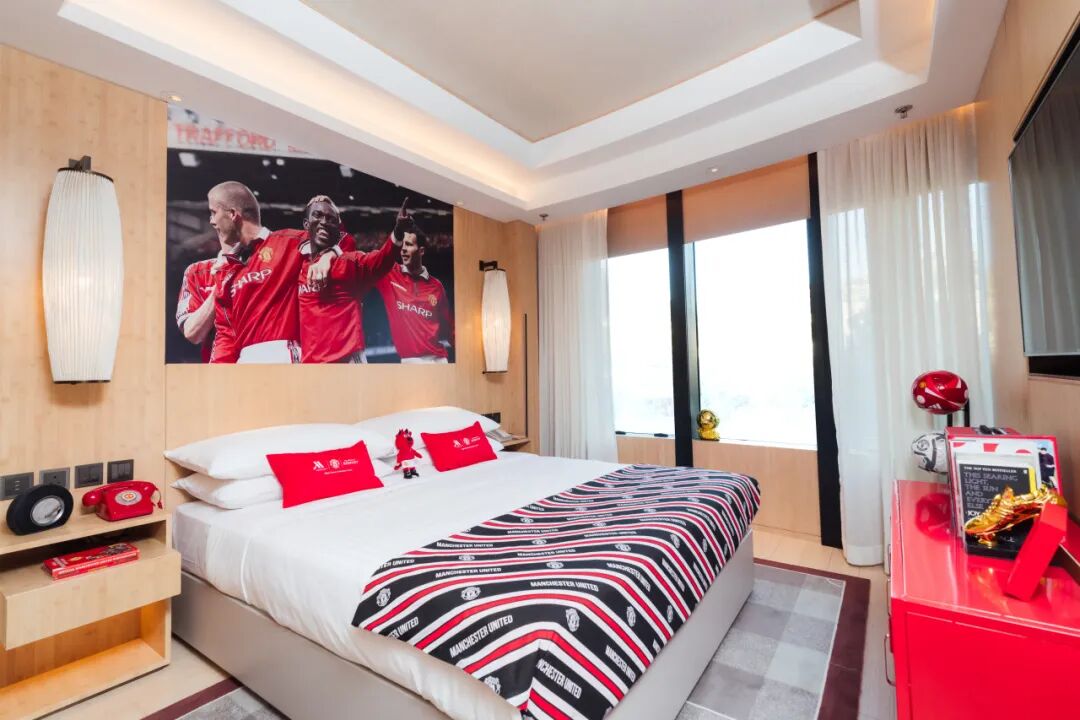 香港海洋公园万豪酒店精心打造的“梦想客房”,纪念曼联1998-1999赛季开始创下英超十年佳绩的三冠王传奇诞生25周年。客房设计汲取“红魔”荣耀元素,充分彰显曼联辉煌成就,复刻出老特拉福德球场场边套房的独特氛围。