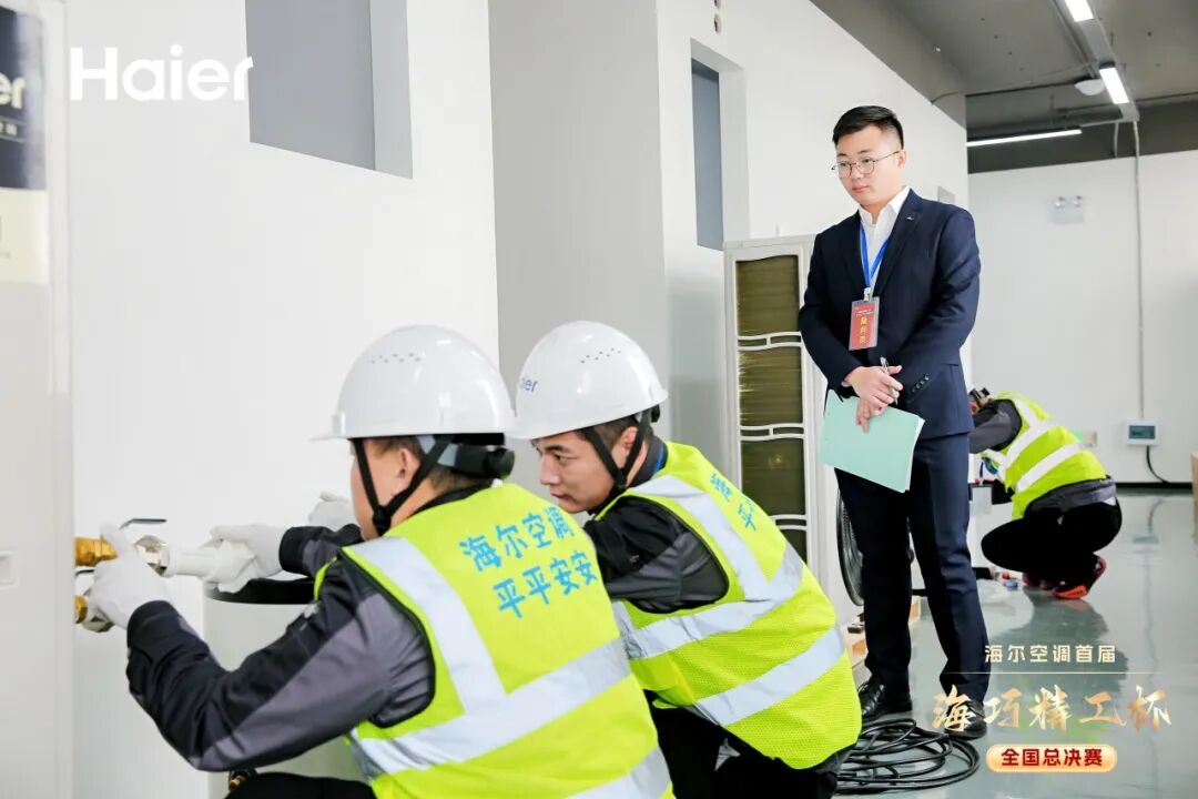 比赛现场,服务工程师们均拼尽全力比拼,从空调的安装到维修均表现突出;而海外的海尔空调服务工程师们,也通过直播形式参与到pk中,充分展现了高水准专业技能和精益求精的工匠精神。裁判现场查看选手表现,打分评定。