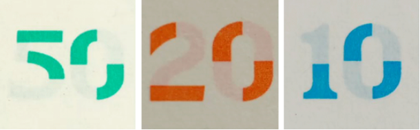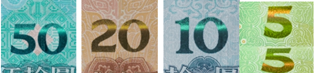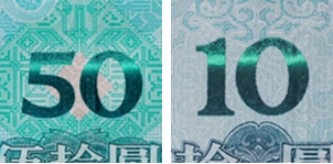 2019年版50元、10元中间那大大的面额数字,转动的时会由( )色变成( )色。