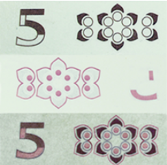 透光观察2020年版第五套人民币5元纸币正面左下角的()和()可以精准重合。