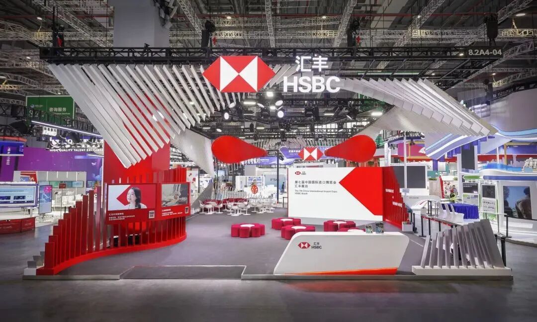 我们今年的展台以汇丰六边形标志为概念,构建了一个流动的开放空间,波浪型的幕帘设计,就像一个正在开启的机遇之盒,展开一片新视界,象征汇丰继续发挥桥梁作用,支持中国企业成功出海,为全球企业联动中国机遇。同时,在展台中全面展示在支持企业全球拓展、数字化金融方案、可持续发展和财富管理等多个领域的最新实践。