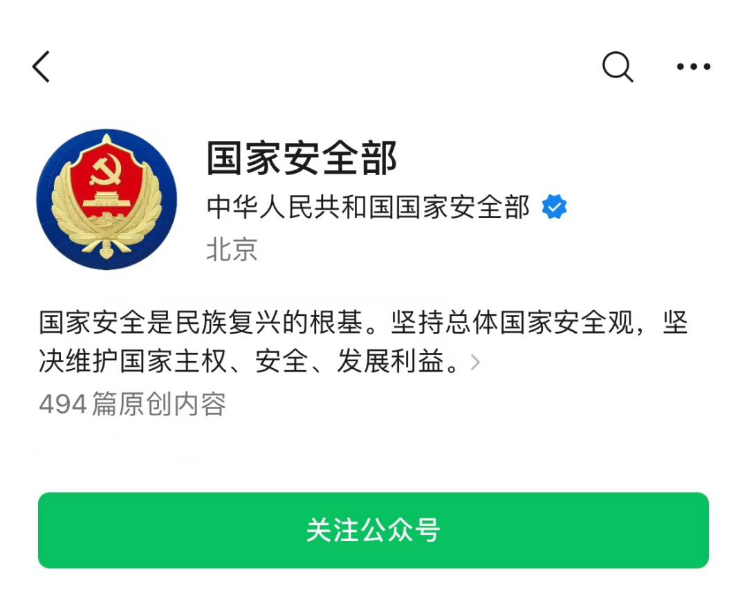 “国家安全部”微信公众号是国家安全部官方信息发布的权威渠道,是开展全民国家安全宣传教育的重要阵地。