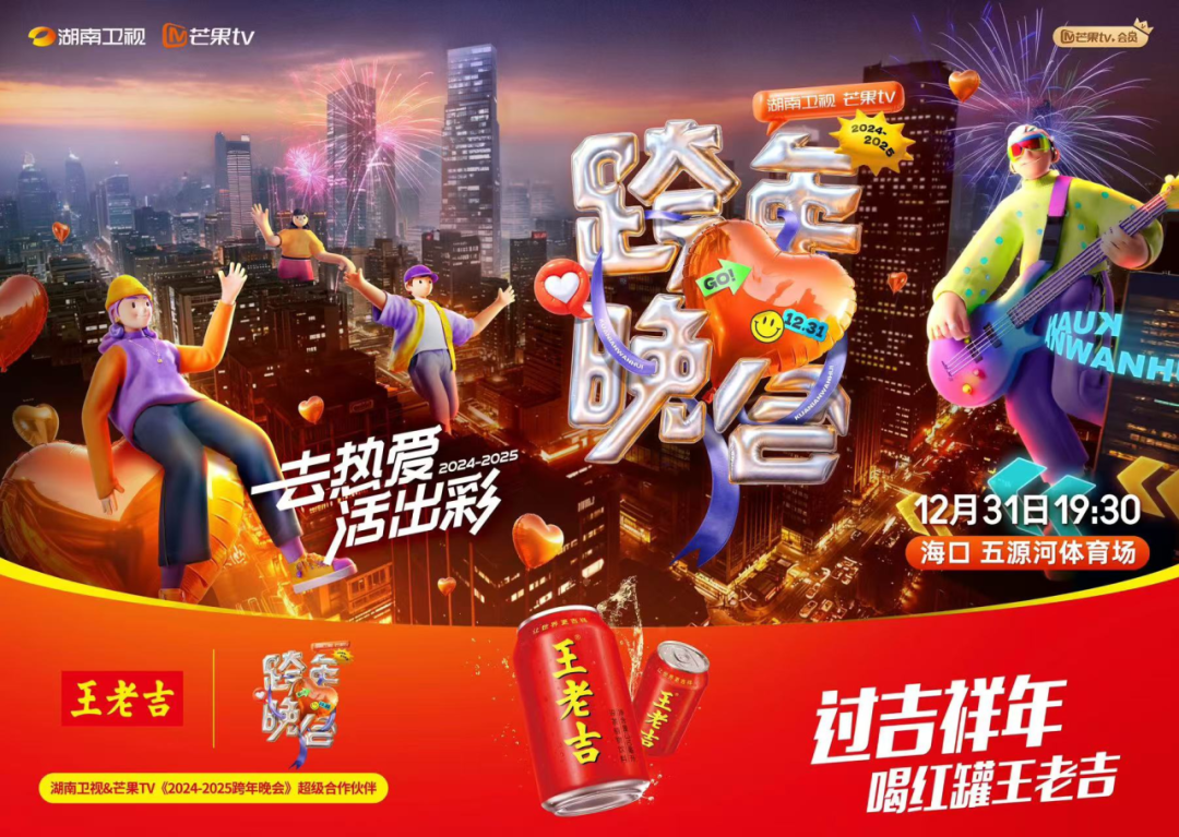 跨年大吉,共赴璀璨新年!王老吉今年作为湖南卫视、芒果TV跨年晚会的超级合作伙伴,将一起亮相跨年晚会现场,等待新年钟声的敲响~本次晚会将进行全方位焕新升级,不仅有新舞台、新创意,更有新伙伴!作为本次超级合作伙伴,王老吉将与观众一起相约海口五源河体育场,直击“芒果跨年”品牌的魅力!