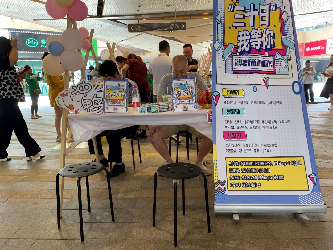 2023年6月9日,新华路街道社区党群服务中心联合IM 长宁国际举办了一场公益市集活动。为楼宇白领、周边居民提供党务接待、户籍政策、计生、普法等政策咨询服务,及免费口腔检查、优惠商品、医疗检查等一站式便民服务。