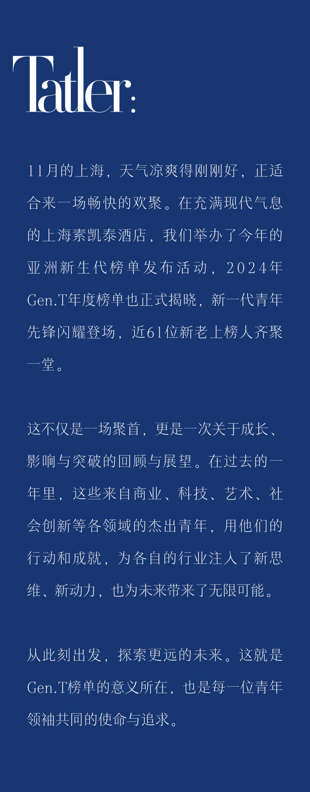 最后,感谢英国汽车品牌MINI、Visit Monano摩纳哥旅游局、新加坡航空公Singapore Airlines、法国高端声学工程品牌帝瓦雷和全球奢华百年葡萄酒品牌奔富对Gen.T榜单的支持,我们共同携手,为每一位上榜人喝彩。