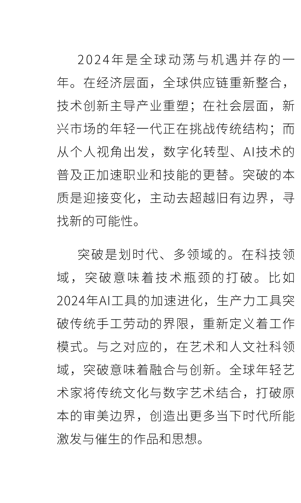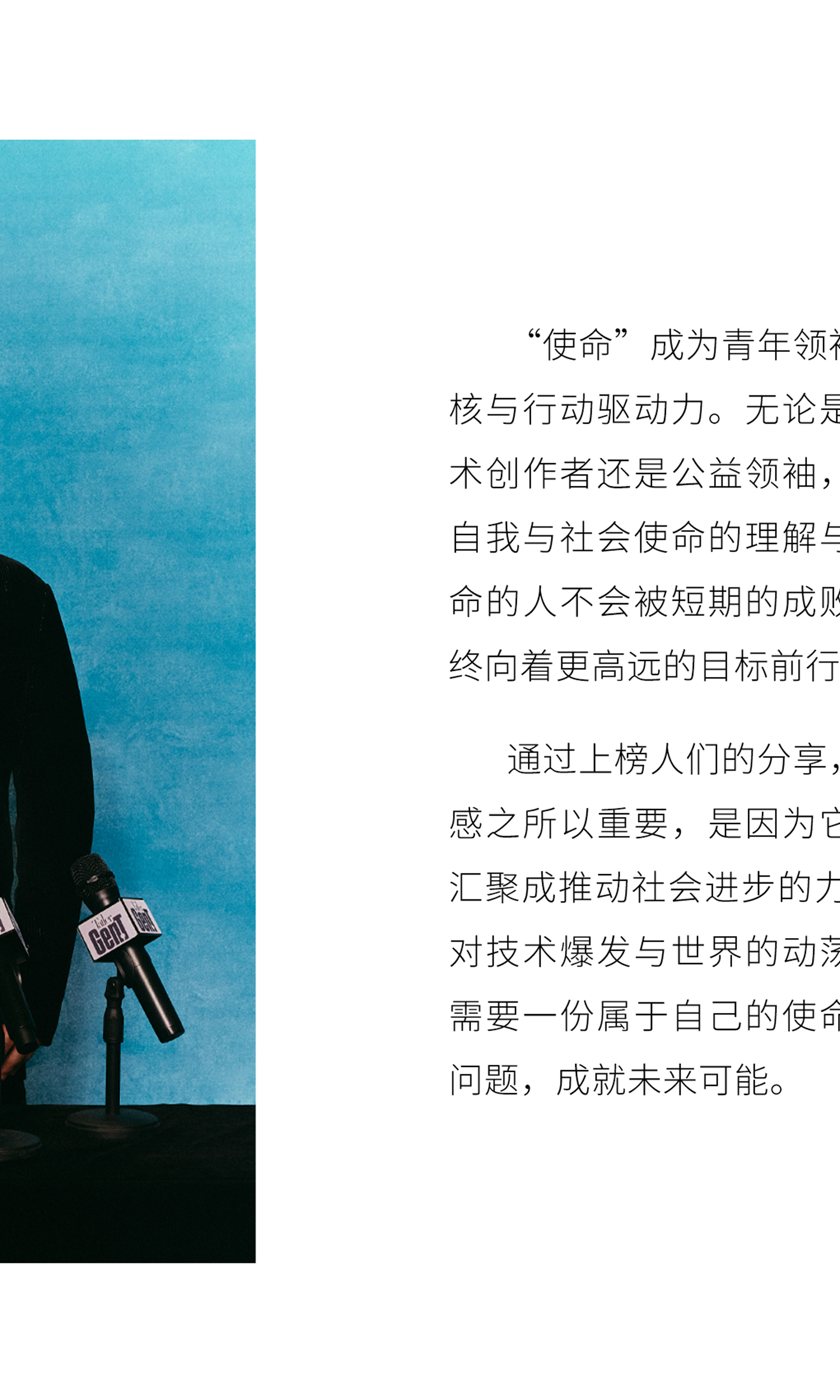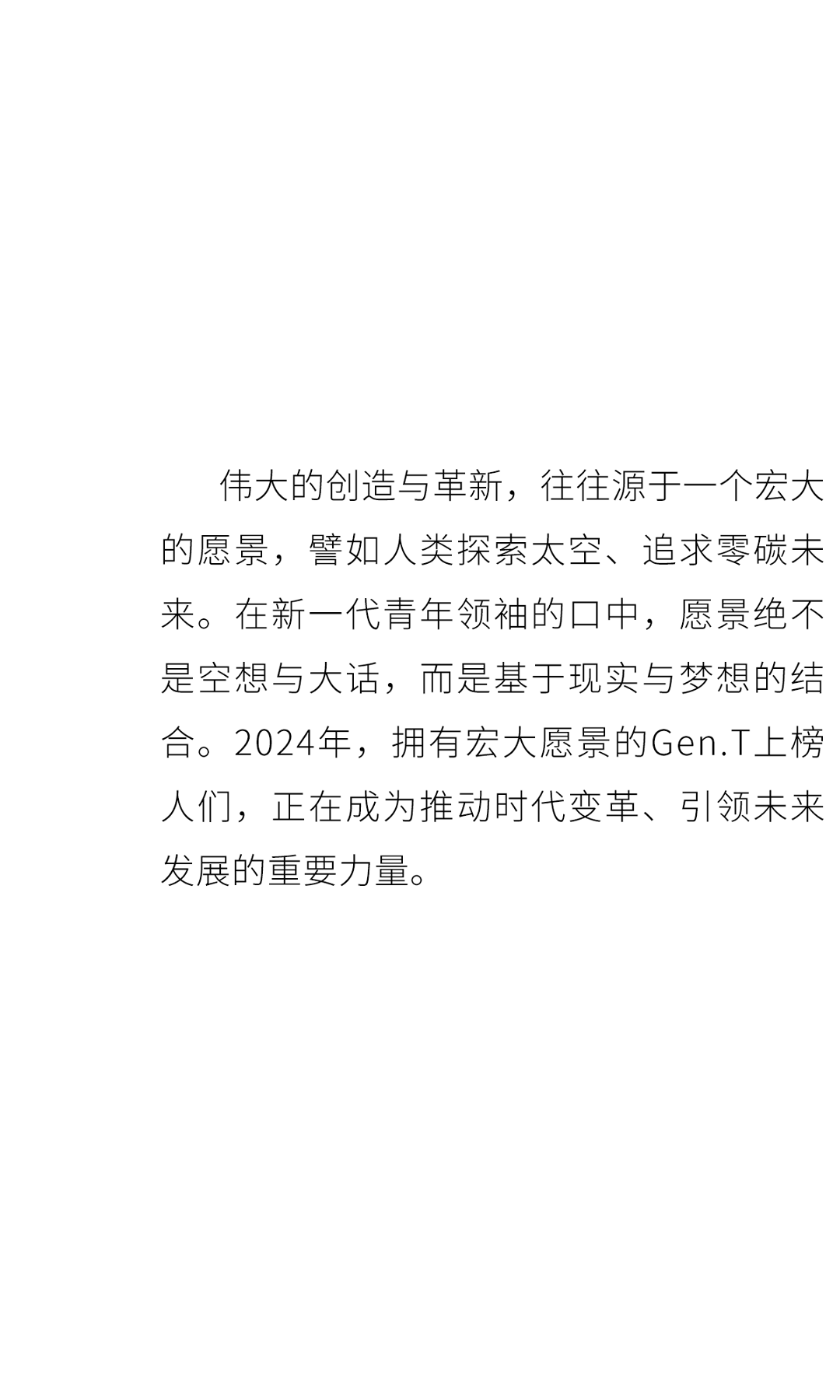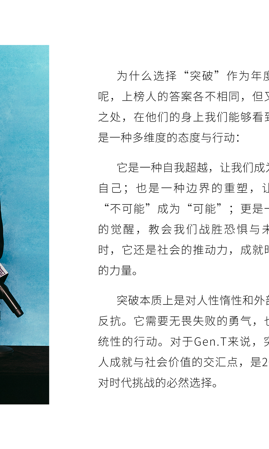 这八个关键词是突破、创新、传承、经典、成长、社会影响力、使命与愿景。它们涵盖了青年一代的方方面面,既有对个体发展的关怀,也有对时代变革的洞察,共同构成了今年Gen.T榜单的主题:破界新声。