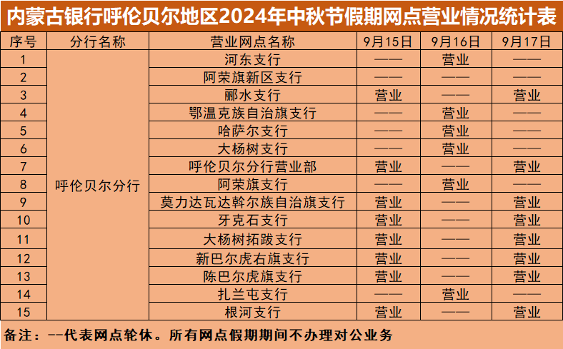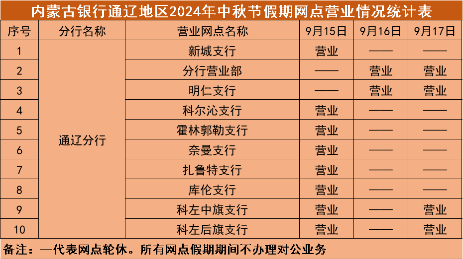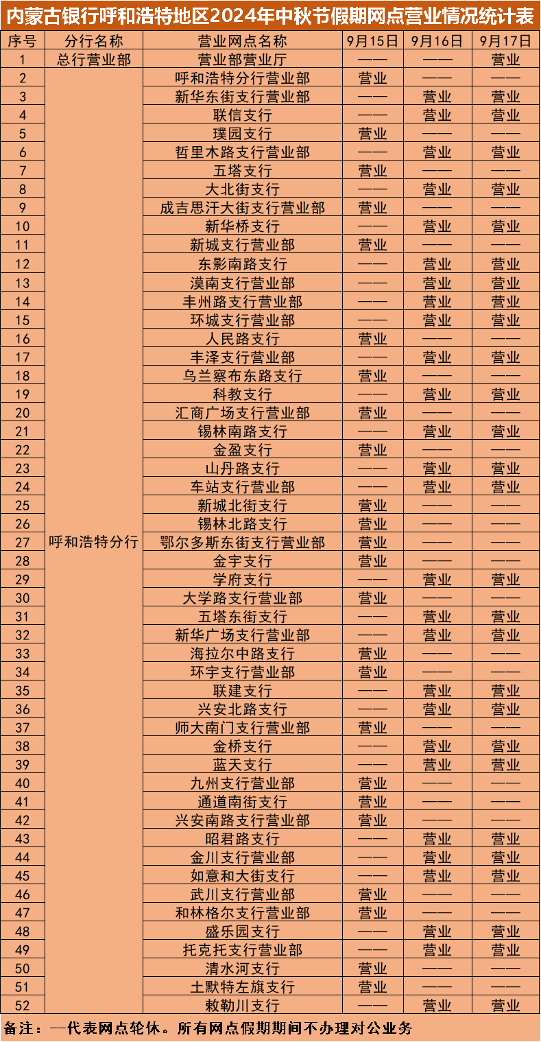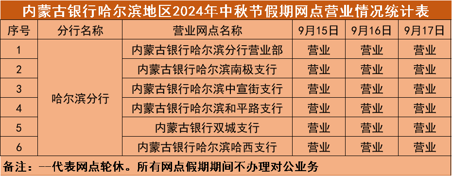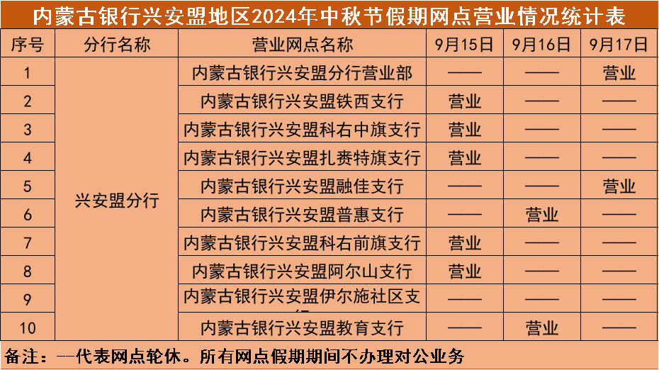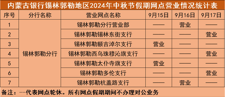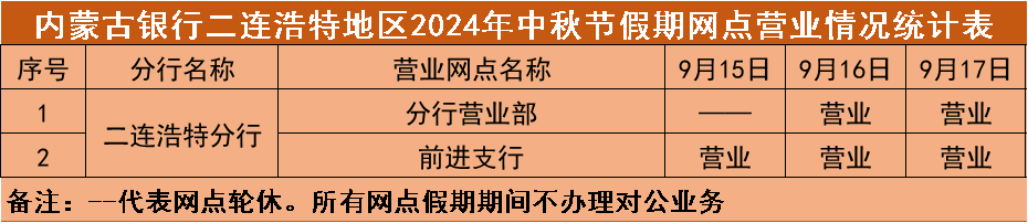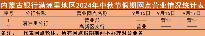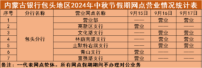 根据《国务院办公厅关于2024年节部分节假日安排的通知》,结合我行实际情况,现将"中秋"假期(2024年9月15日—9月17日)营业网点营业时间安排予以公告,营业期间只办理个人业务。