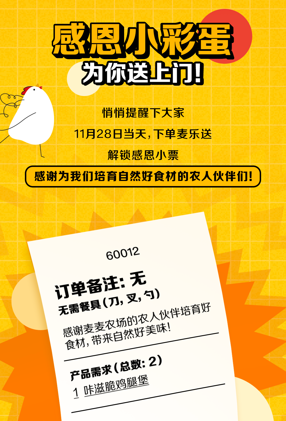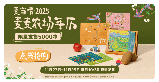 活动外送渠道限任意消费(卡券核销不参与)加购享,每单限一份。本活动自2024年11月6日至2024年12月3日,仅在全国部分餐厅适用(不含港澳台地区餐厅,不含交通枢纽、服务区、旅游景区等特殊餐厅)具体以店内公示为准。活动渠道:麦当劳App、麦当劳微信/支付宝小程序的到店取餐及麦乐送渠道。上述产品仅限早餐时段后供应,早餐时段至上午10:30结束,以餐厅实际情况为准。除推广产品外,其他物品不在售卖范围。不与其他优惠同享。麦麦咔滋脆鸡腿堡全国各渠道共900万份,售完即止。温馨提示:麦麦咔滋脆鸡腿堡中含有奇亚籽,婴幼儿不宜食用。麦麦咔滋脆鸡腿堡中含花生酱。