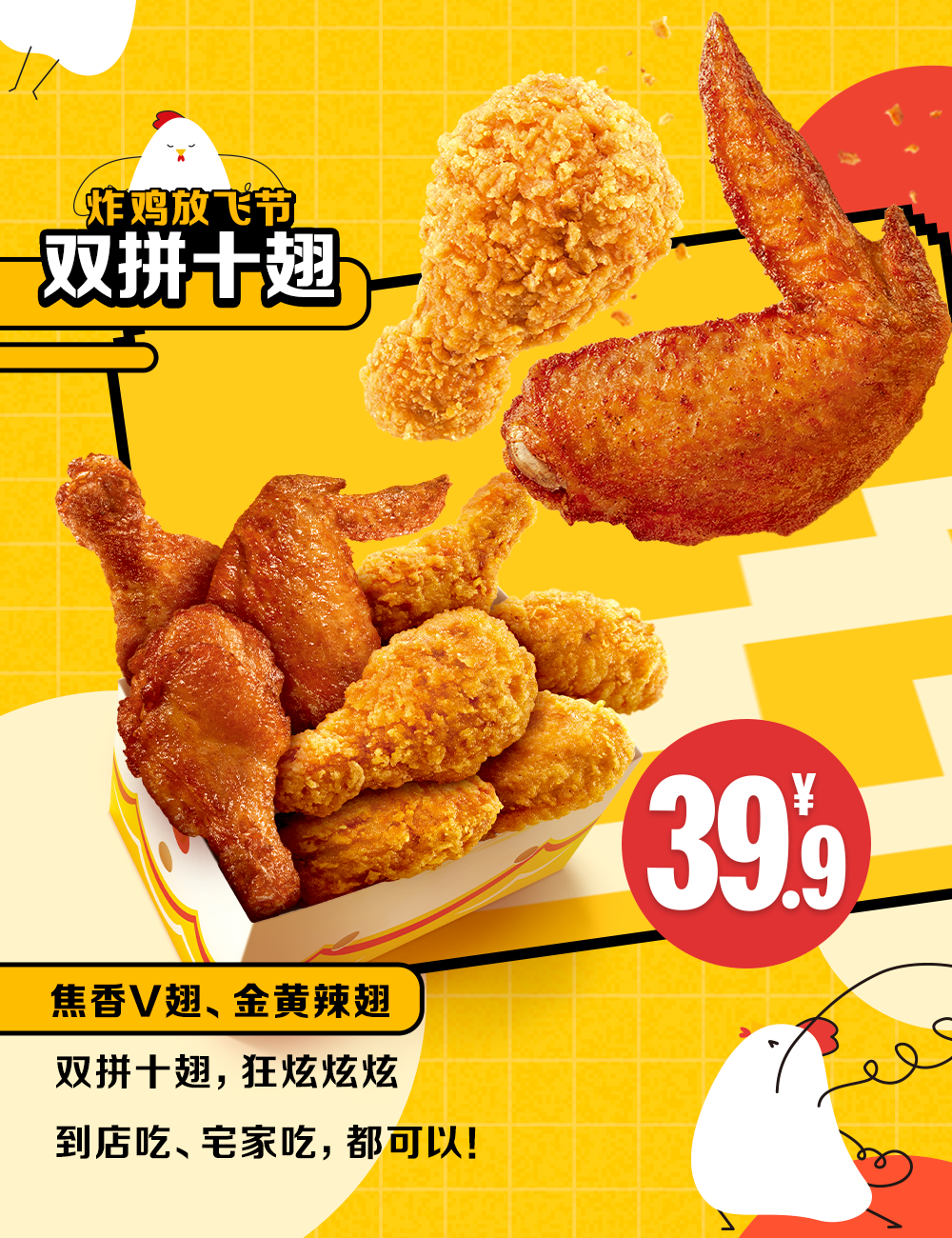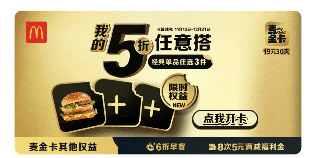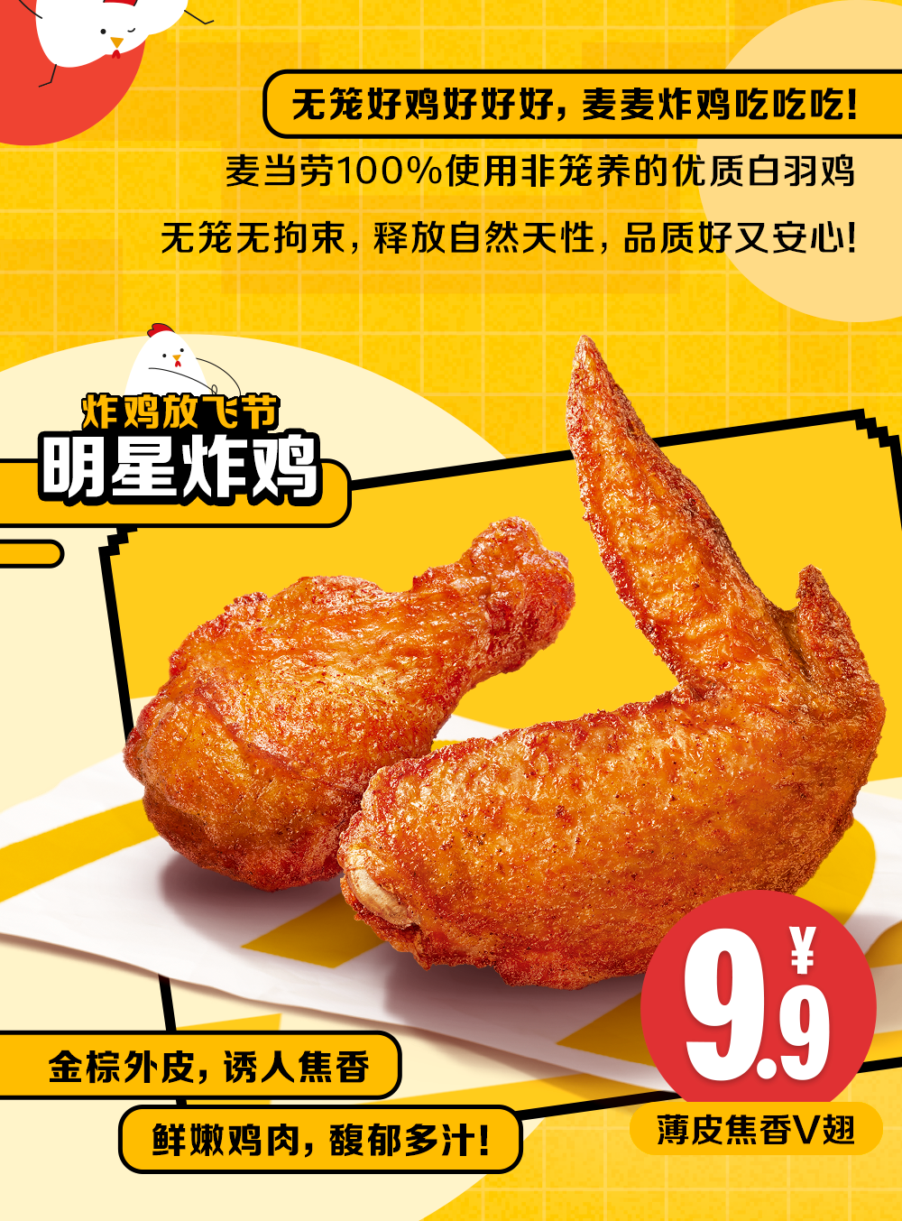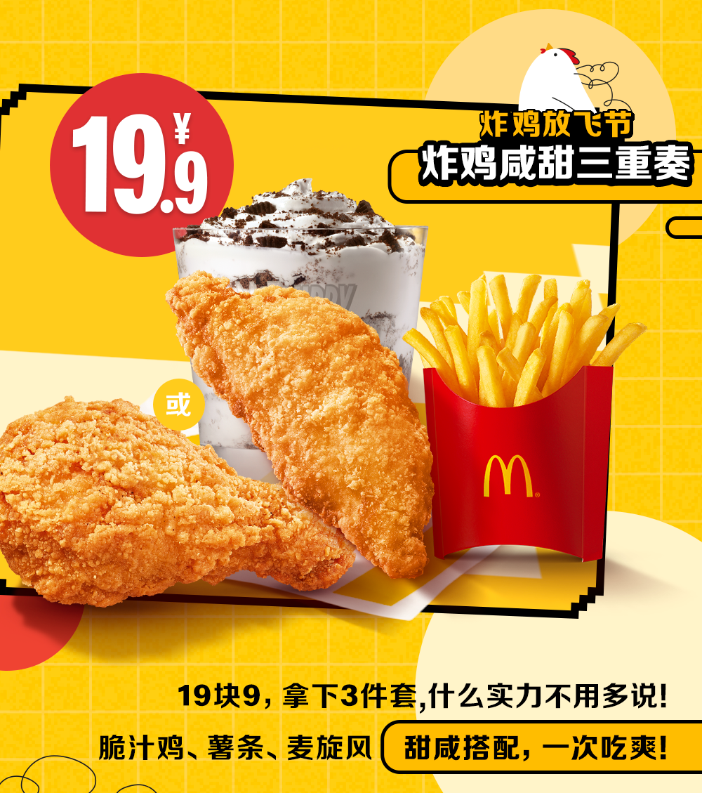本活动自2024年11月06日至2024年12月01日每日 10:30-23:59可享,仅在全国部分餐厅适用(不含甜品站,不含港澳台地区餐厅,不含交通枢纽、服务区、旅游景区等特殊餐厅),具体以店内公示为准。活动渠道:麦当劳 App及麦当劳微信/支付宝小程序的到店取餐、餐厅柜台、自助点餐机、抖音、天猫、美团等渠道参与。外送渠道外送费另计。活动产品:①薄皮焦香V翅,价格为 9.9元,内含物为薄皮焦香V翅2块,活动时间为2024年11月11日-2024年11月17日以及2024年11月25日-2024年12月01日;②麦麦脆汁鸡价格为 9.9元,内含物为麦麦脆汁鸡-鸡胸*1(鸡腿可选),活动时间为 2024年 11月18日-2024年11月24日,③超值王“排“三件套,价格为19.9元,内含物为那么大鸡排*1+菠萝派*1(香芋派可选)+奥利奥麦旋风*1(草莓麦旋风*1、阿华田脏脏麦旋风*1、中杯可乐*1可选),活动时间为2024年11月18日-2024年11月24日;④薄皮V翅双拼十翅,价格为39.9元,内含物为麦辣鸡翅2块*3+薄皮焦香V翅2块*2,活动时间为2024年11月18日-2024年12月01日,麦乐送同享,外送费另计。⑤炸鸡咸甜三重奏,价格为19.9元,内含物为麦麦脆汁鸡-鸡胸*1(琵琶腿*1可选)+薯条(中)*1+奥利奥麦旋风*1(阿华田脏脏麦旋风*1,草莓麦旋风*1、中杯可乐*1可选)活动时间为2024年11月25日-2024年12月01日。上述产品仅限每日10:30-23:59可享,以餐厅实际情况为准。除推广产品外,其他物品不在售卖范围。如遇产品售罄,餐厅将视餐厅供应情况为您替换价格相当产品,以餐厅实际供应为准。不与其他优惠同享。