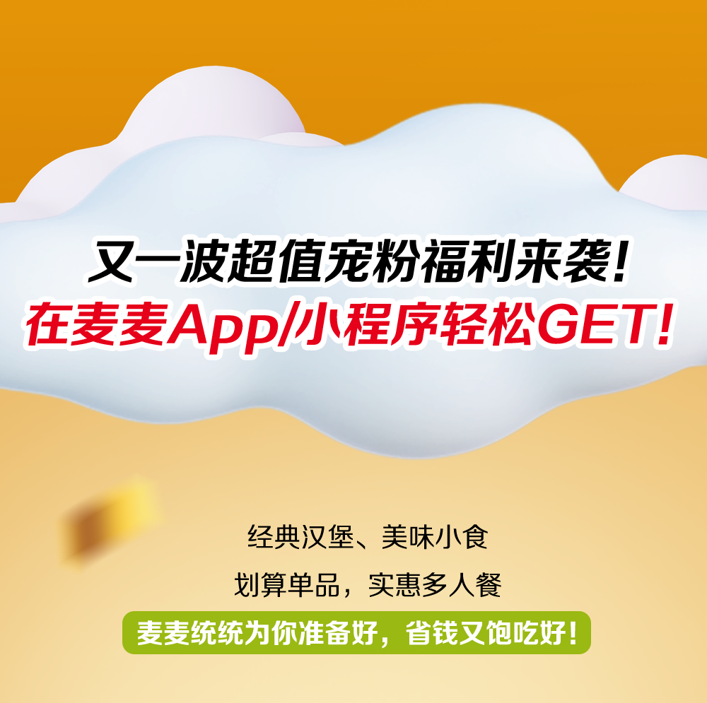 活动自2024年10月21日至2024年11月11日,仅在全国部分餐厅适用(不含港澳台地区餐厅,不含交通枢纽、服务区、旅游景区等特殊餐厅),具体以店内公示为准。活动渠道:麦当劳 App/麦当劳微信/支付宝小程序的到店取餐、自助点餐机。部分产品支持麦乐送,使用麦乐送下单的,外送费另计,详见下单页。上述产品仅限早餐时段后供应,早餐时段至上午10:30结束,以餐厅实际情况为准。除推广产品外, 其他物品不在售卖范围。如遇产品售罄,餐厅将视餐厅供应情况为您替换价格相当产品,以餐厅实际供应为准。不与其他优惠同享。