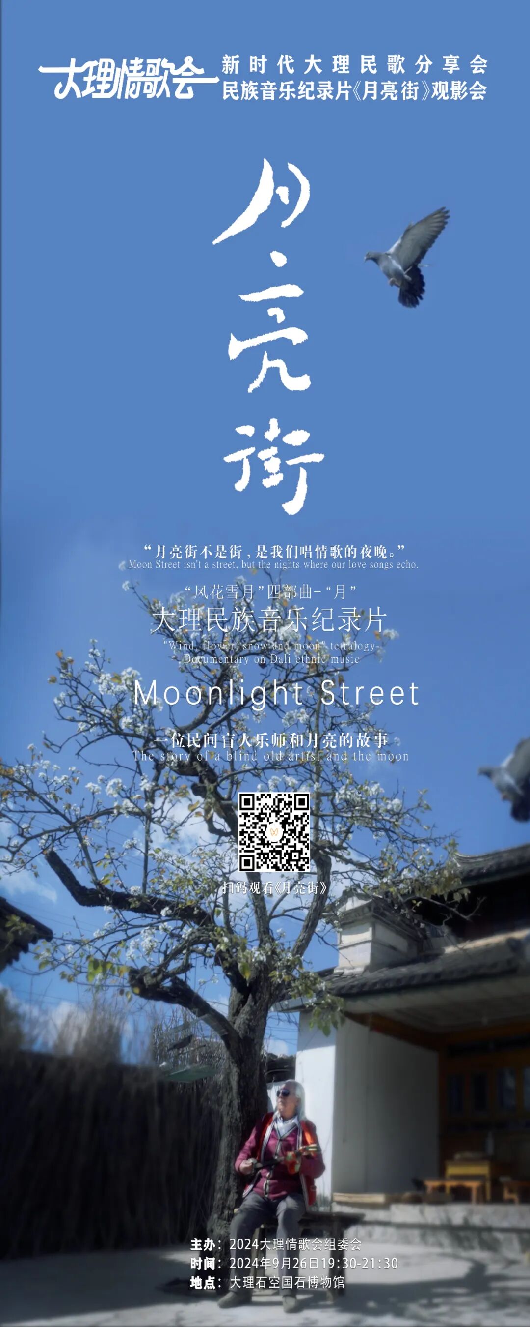 活动中,众嘉宾现场观看了大理民族音乐纪录片《月亮街》。该片于今年9月15日正式上线,是继《一掌雪》之后,由原班主创为大理“风花雪月”系列接力创作的“月”主题故事,由大理州委宣传部出品,辜小军问乡工作室摄制,改编自白族作家又凡的同名小说,讲述了一位盲眼艺人和月亮的故事。