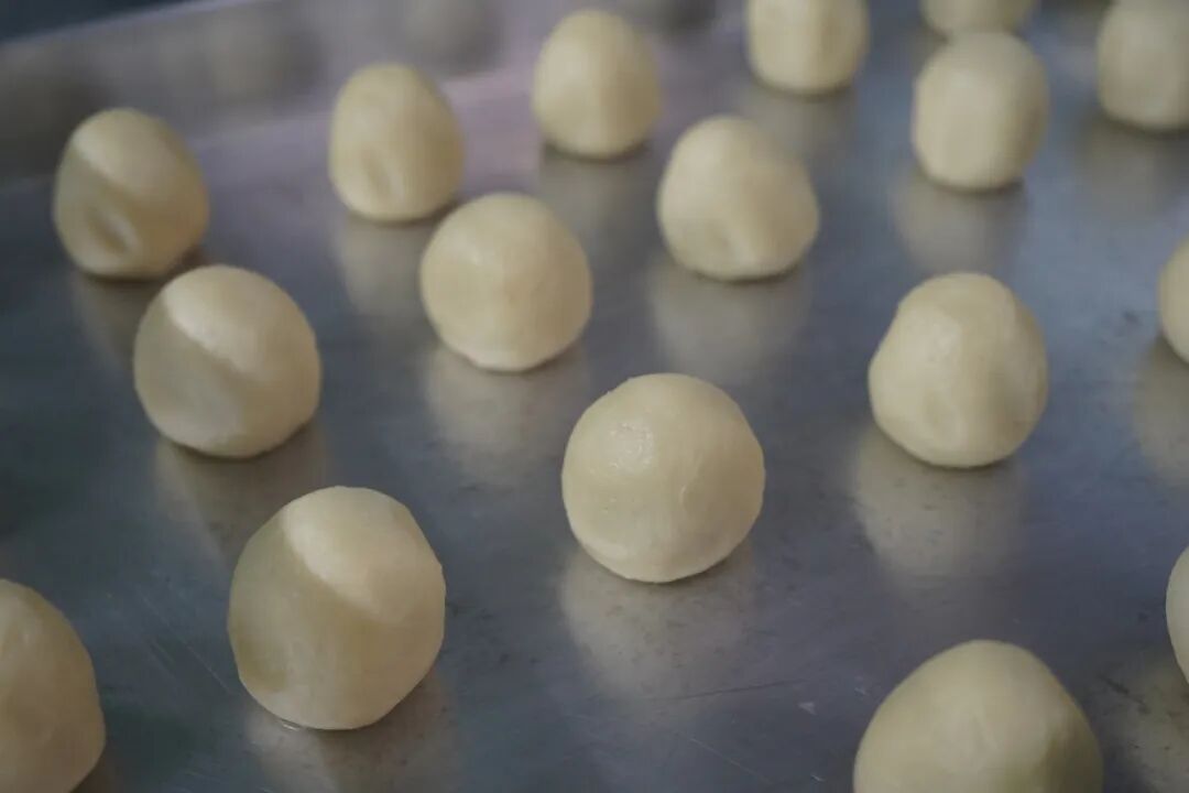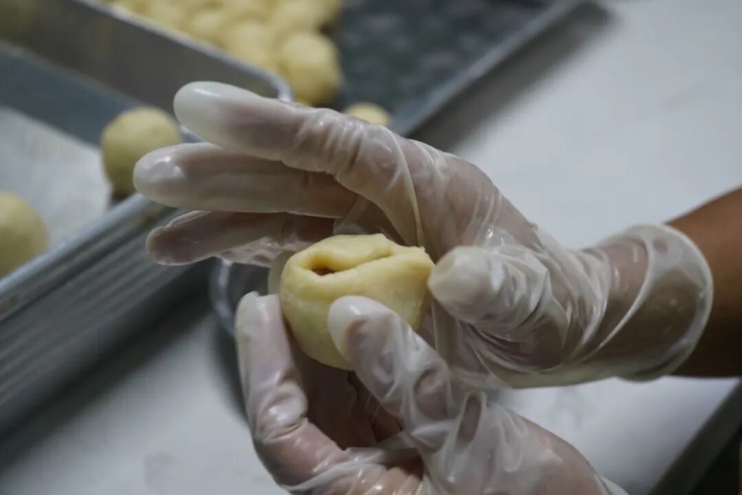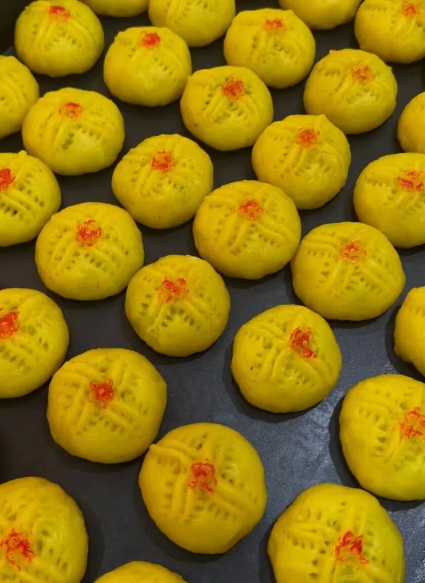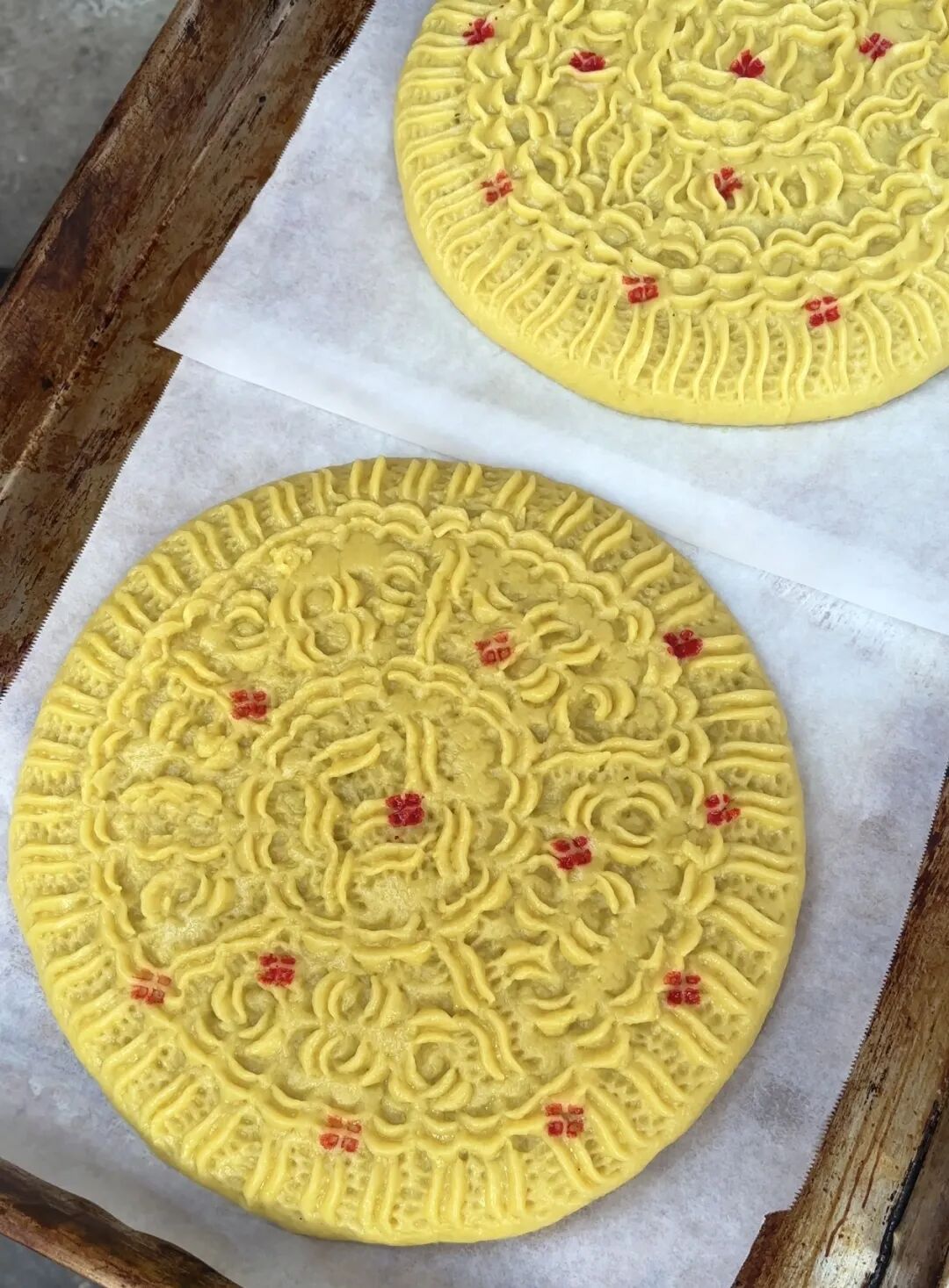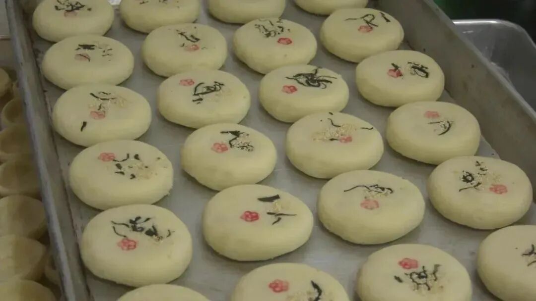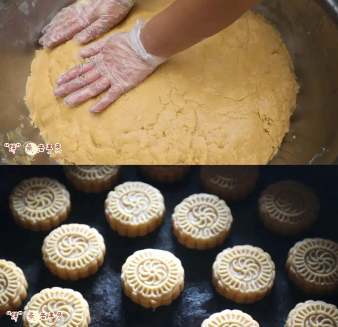 蒸好的面粉是制作小月饼的另一个“主角”,锅中烫熟的菜籽油倒入面粉中趁热搅拌,适当冷却后反复揉捏形成粘软适宜的面团,压制成型,俏皮可爱的小月饼陆陆续续诞生了。