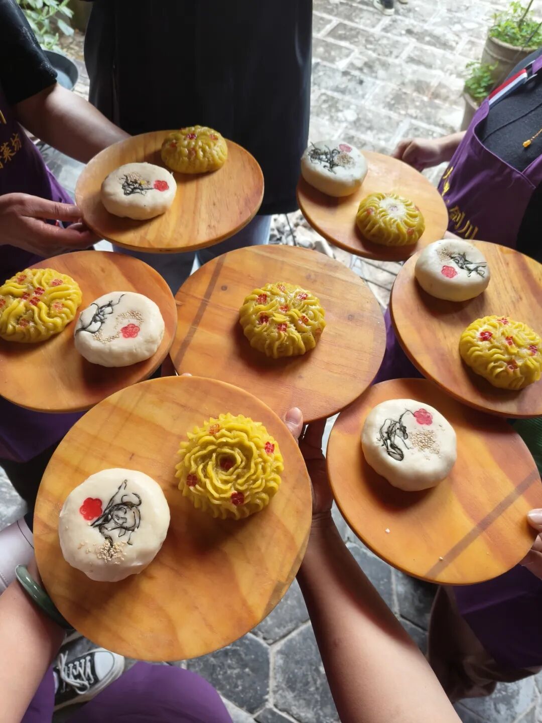 剑川的大月饼制作,会在捏好的月饼上,用特制的夹子夹出寓意团圆的“月”字和多子多福的石榴等图案,大都是五福临门、花好月圆之意。