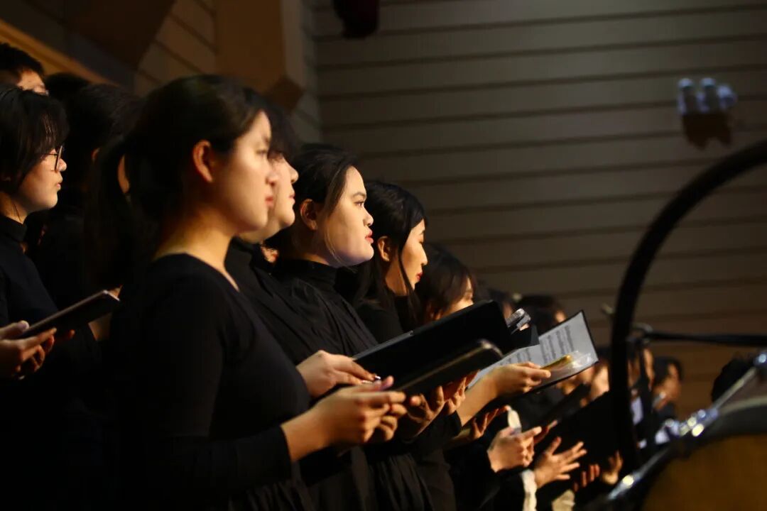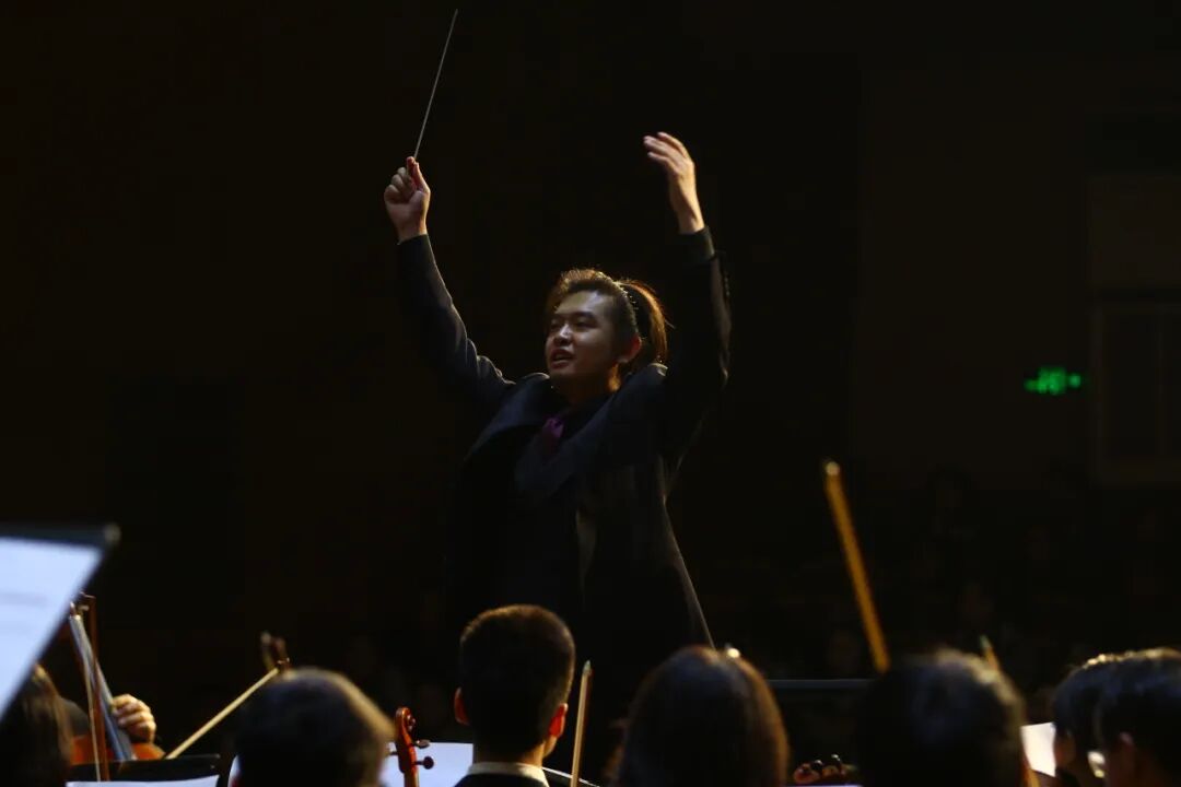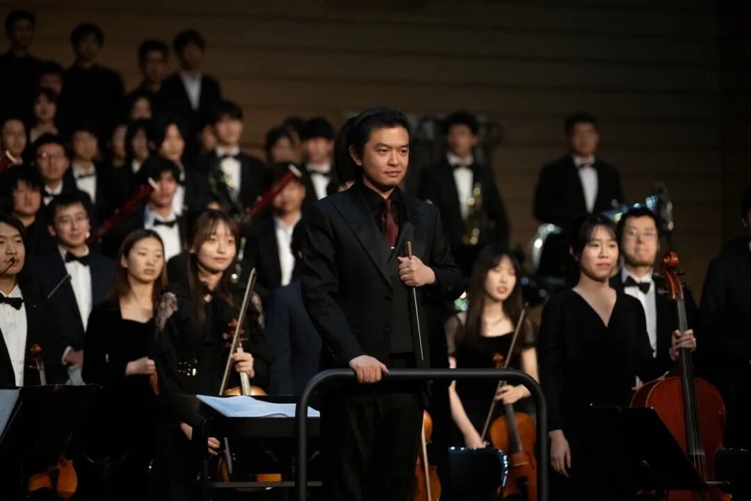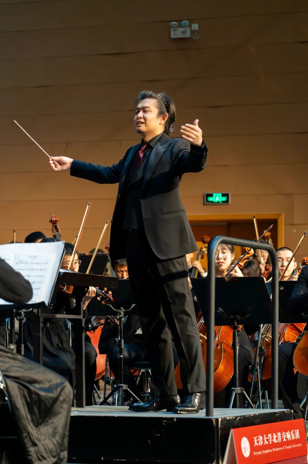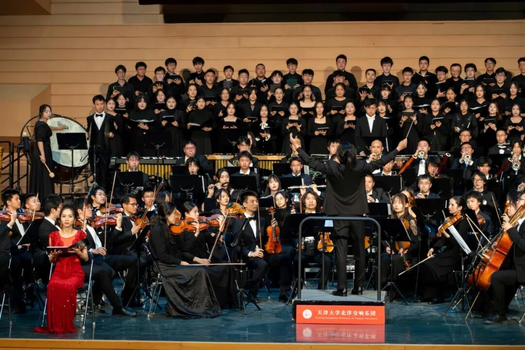下半场,青年指挥高崇博携手青年抒情女高音郝音、青年男高音王健、青年女中音马林祺、青年男中音刘乐,指挥北洋交响乐团和北洋合唱团共同演绎了交响合唱作品《大学》。该作品是国内首部以“大学”为题材的交响合唱作品,由天津大学北洋艺术团驻团作曲家、天津音乐学院教授陈乐昌先生谱曲,著名词作家吴悠先生作词。