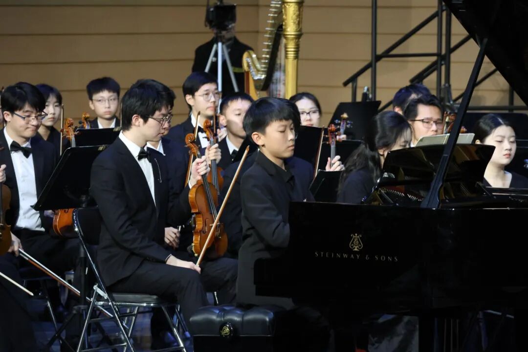 音乐会上半场,青年指挥高崇博携手天津茱莉亚学院预科冯天佑同学共同上演了由我国著名作曲家、音乐教育家饶余燕先生于1979年创作完成的钢琴协奏曲《献给青少年》。冯天佑同学轻松活泼、娴熟精湛的演奏赢得全场观众雷鸣般的掌声。