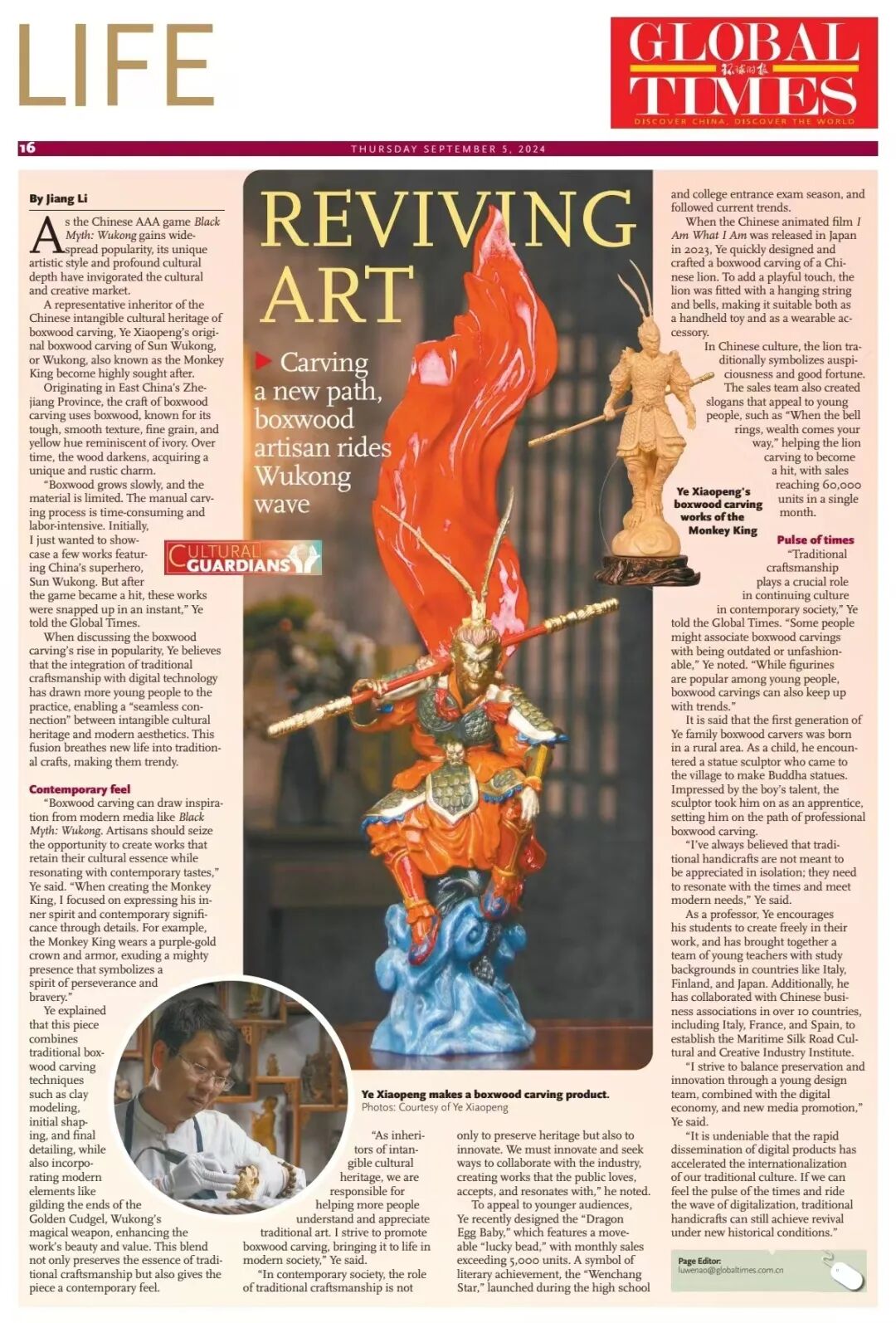 环球时报英文版9月5日以《复兴艺术:开辟新路,黄杨木雕大师搭上悟空热潮》为题,整版刊登我校传媒与设计艺术学院教授、中国工艺美术大师叶小鹏带领学生团队创作黄杨木雕作品的故事。