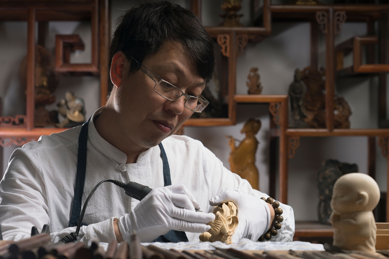 Ye Xiaopeng makes a boxwood carving product.