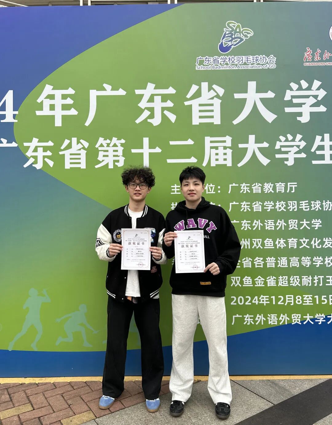 近日,2024年广东省大学生羽毛球锦标赛暨广东省第十二届大学生运动会羽毛球预赛在广东外语外贸大学大学城校区体育馆圆满落幕。我校羽毛球队在此次比赛中表现抢眼,取得了优异的成绩,其中男双组合杨伟杰和阮炜豪更是夺得男双第四名,为我校羽毛球项目赢得了荣誉。