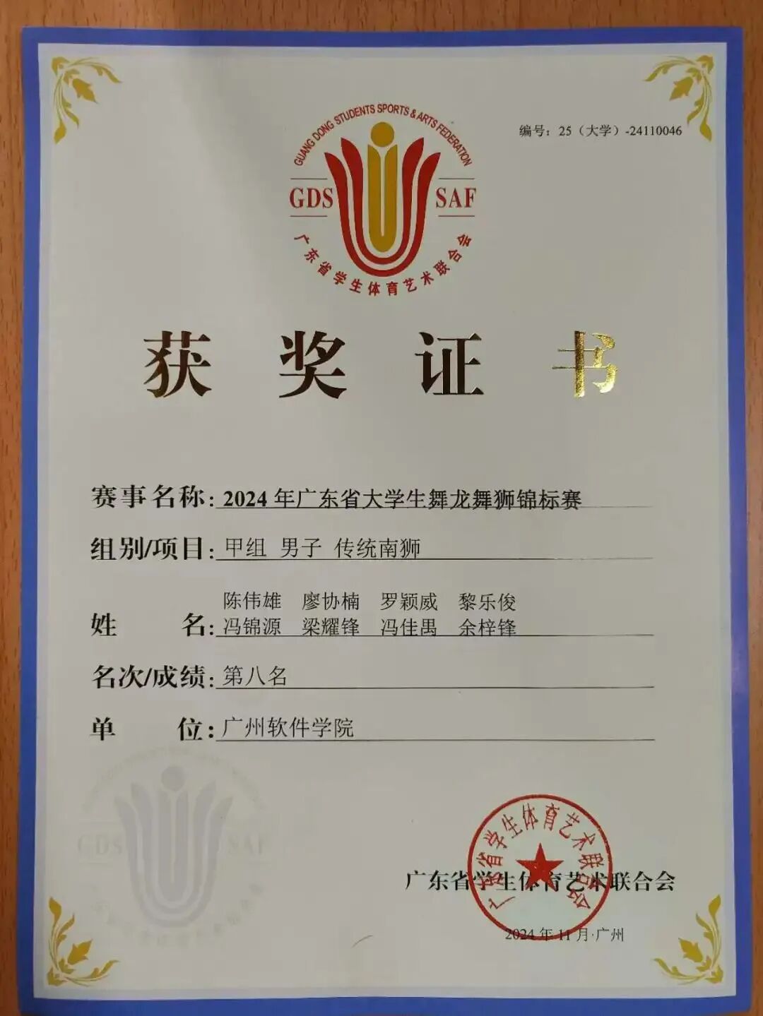 2024年广东省大学生舞龙舞狮锦标赛有近60所高校的235支队伍、1900名选手同台竞技,参赛人数创下新高,竞技水平显著提升,竞争异常激烈。本届赛事首次引入高桩南狮项目,并对其进行了创新改良,降低了高桩的高度和距离,吸引了8支队伍踊跃参与。在本次锦标赛中,我校代表队以精彩的表演脱颖而出,荣获甲组男子传统南狮第八名。